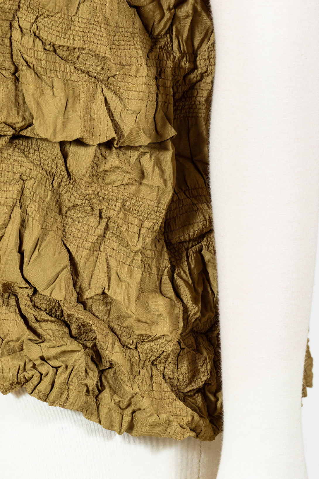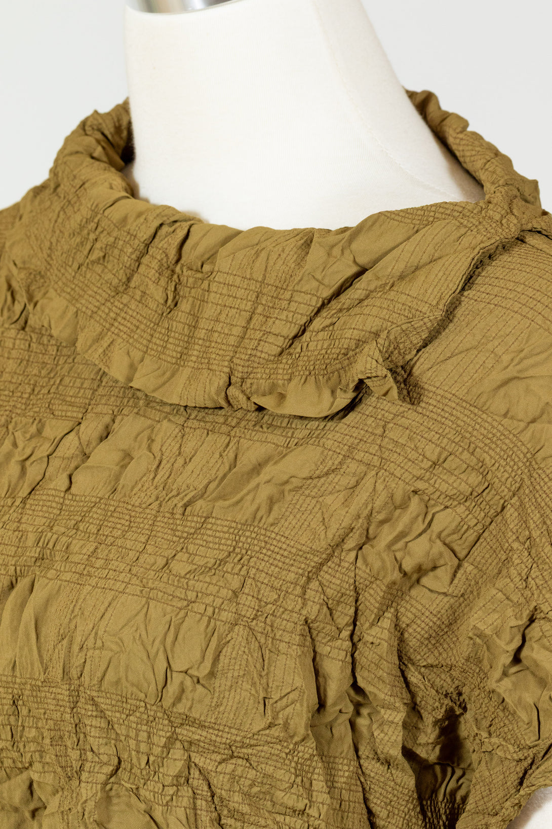 The Anya Top by Chalet brings modern elegance with its asymmetrical pleat detailing, dolman short sleeves, and distinctive split fold-over collar. Crafted from a rich fall-hued, embossed woven crushed fabric, it features a relaxed, boxy silhouette that sits away from the body for effortless comfort. A layered hem detail across the hip adds dimension, while the asymmetrical hem and hip-length cut enhance its contemporary edge. No pockets.