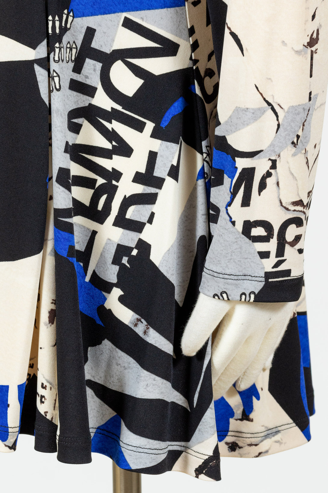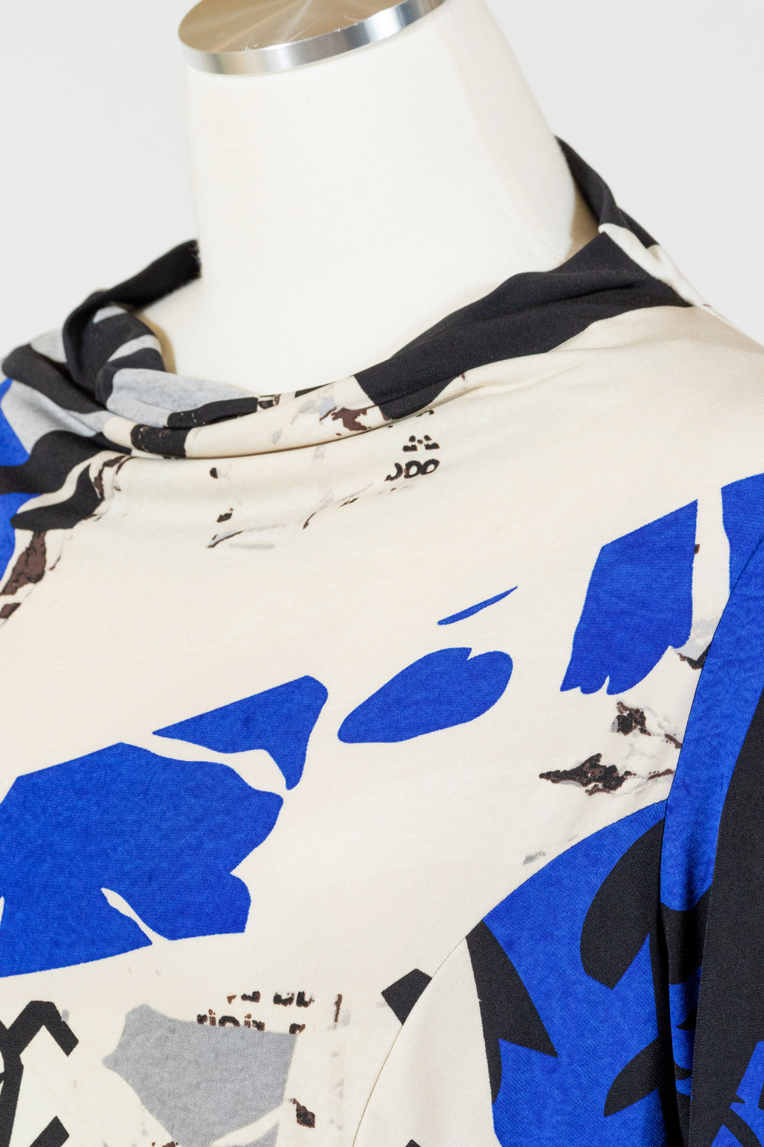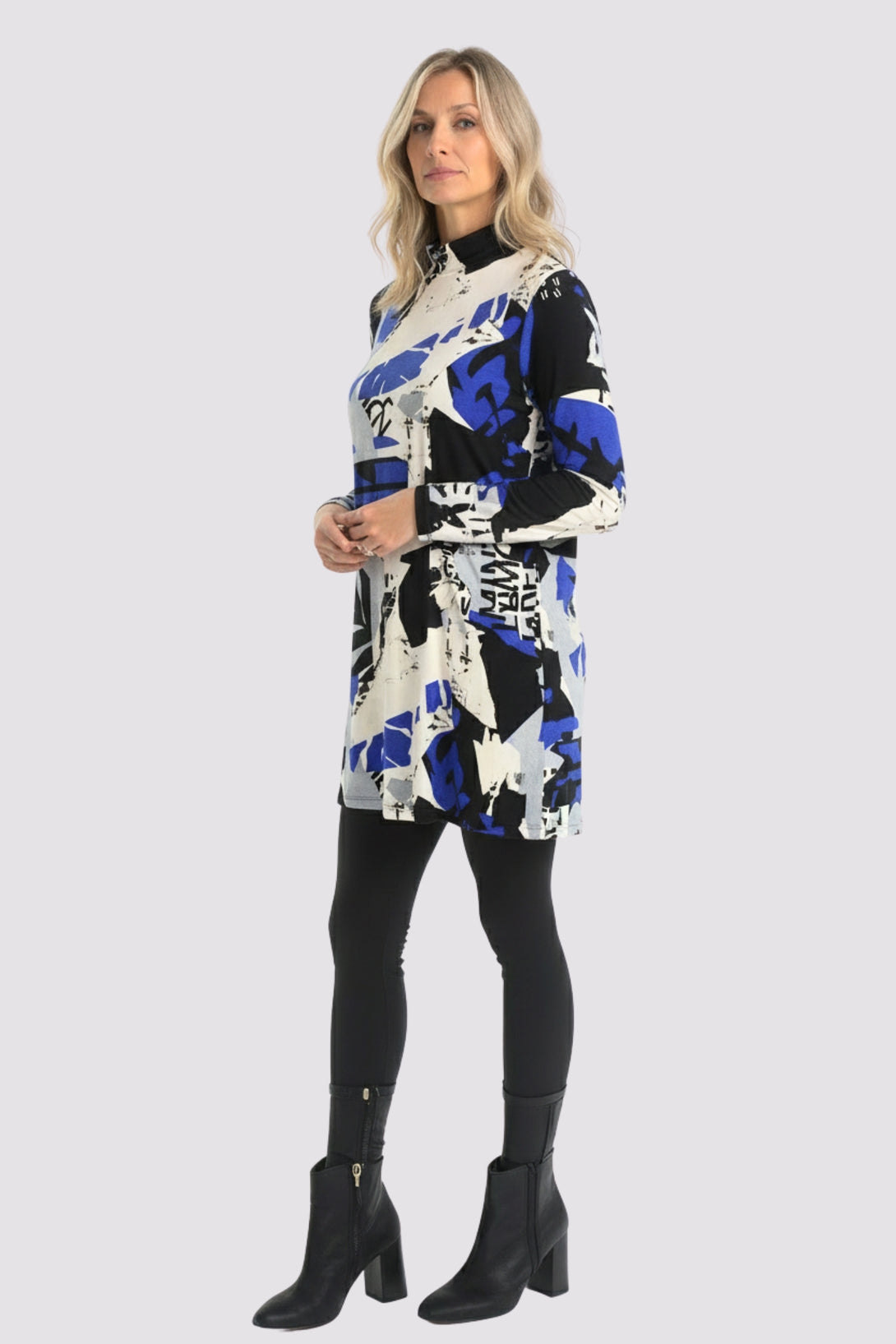 The Brixley Top by Chalet features a relaxed cowl neckline and long sleeves, with subtle pleats in the side gather that create a gentle, flowy drape on one side. Tunic-length and crafted in a stretch jersey with a bold geometric print of black, blue, and neutral tones. This swingy top combines effortless elegance with a smooth, relaxed fit. With no pockets, it’s perfect for layering or wearing on its own for a chic, polished look.