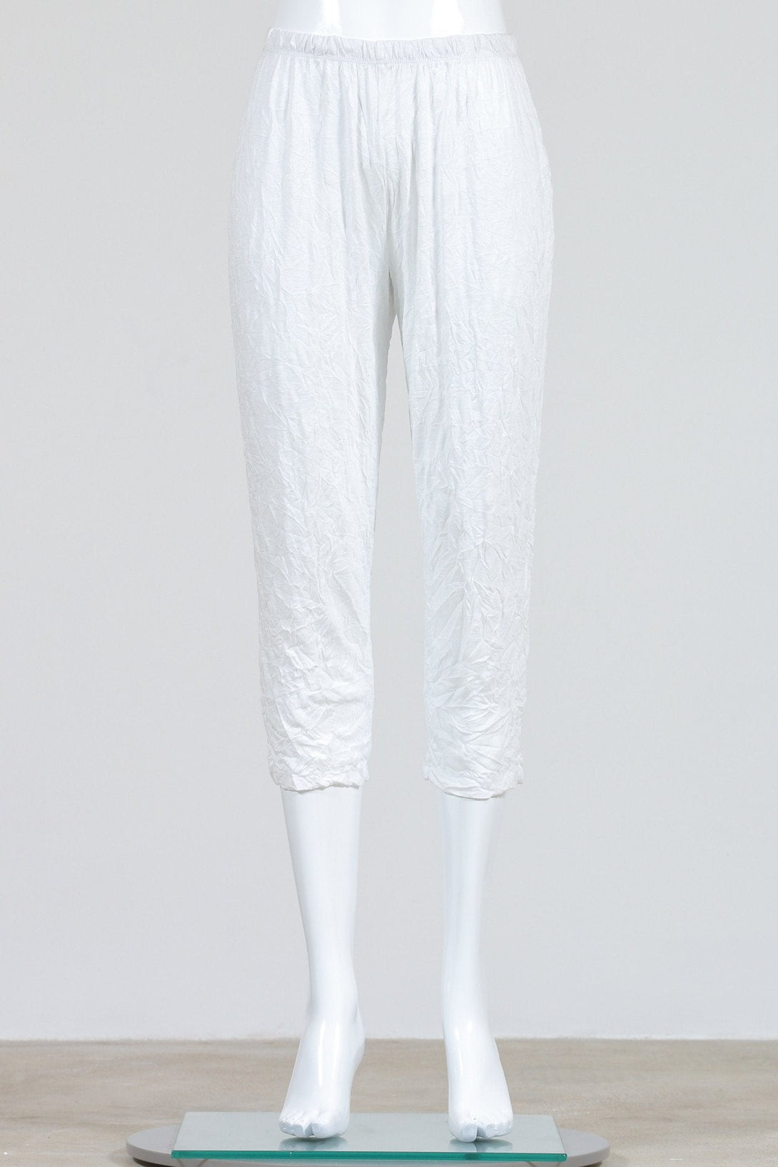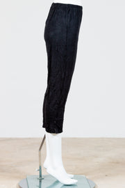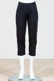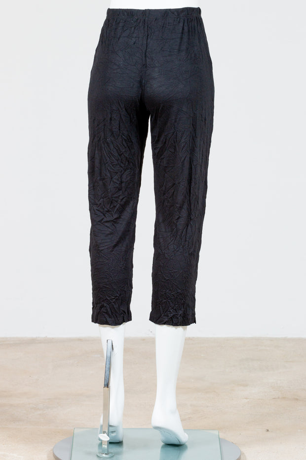 Chalet's Slit Pant (Crinkle) are cropped length with a slim leg. Super comfortable with an elastic waist, these pull-on cropped pants have a clean line with no pockets. Falls to about mid-shin on most. Side slit hem.