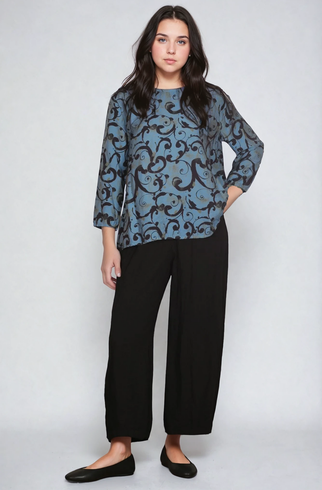 A standout piece for fall, this A-line top by Cut Loose has a silky-soft feel and an easy, flattering drape. It features a classic crew neckline, three-quarter sleeves, and a swingy silhouette that falls to about mid-hip. The black swirl pattern is elevated with subtle gold brushstroke accents, giving it a rich, artful touch. With no pockets and a clean finish, it’s an effortlessly elegant choice that dresses up or down with ease.