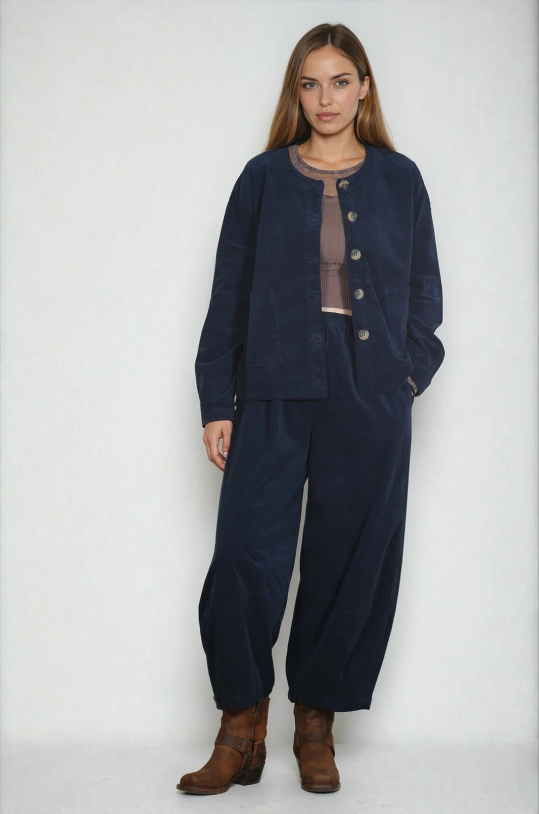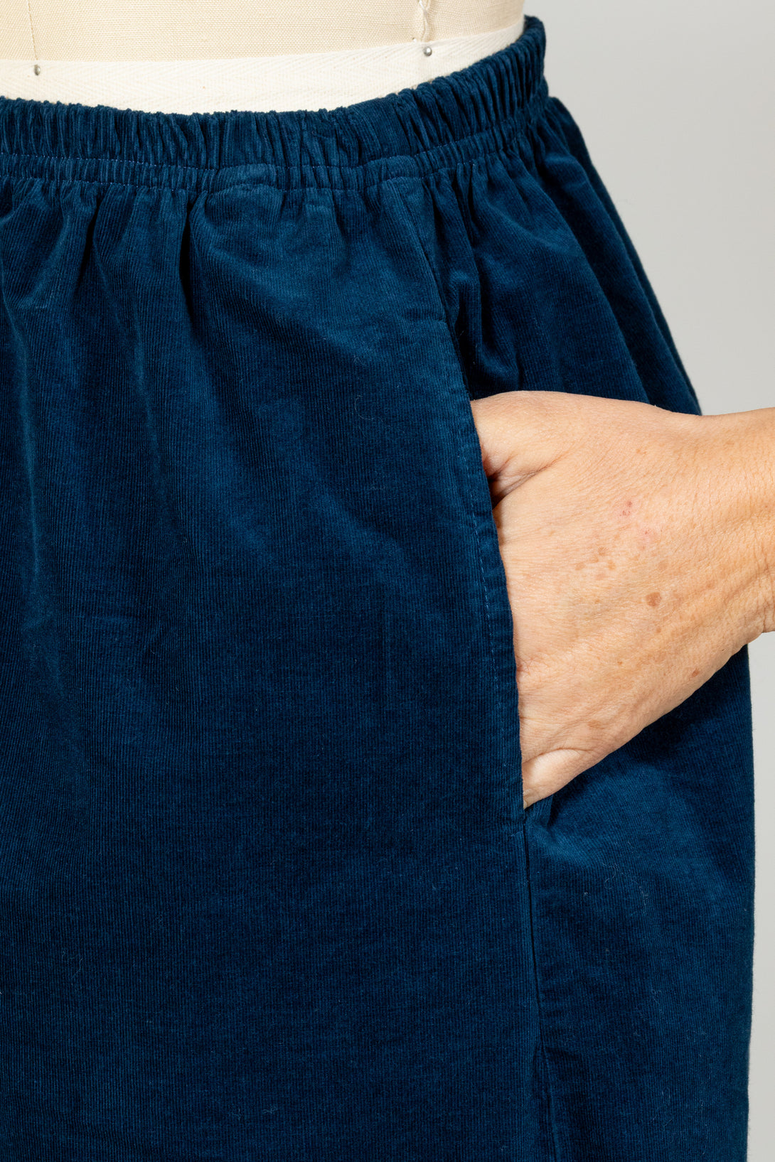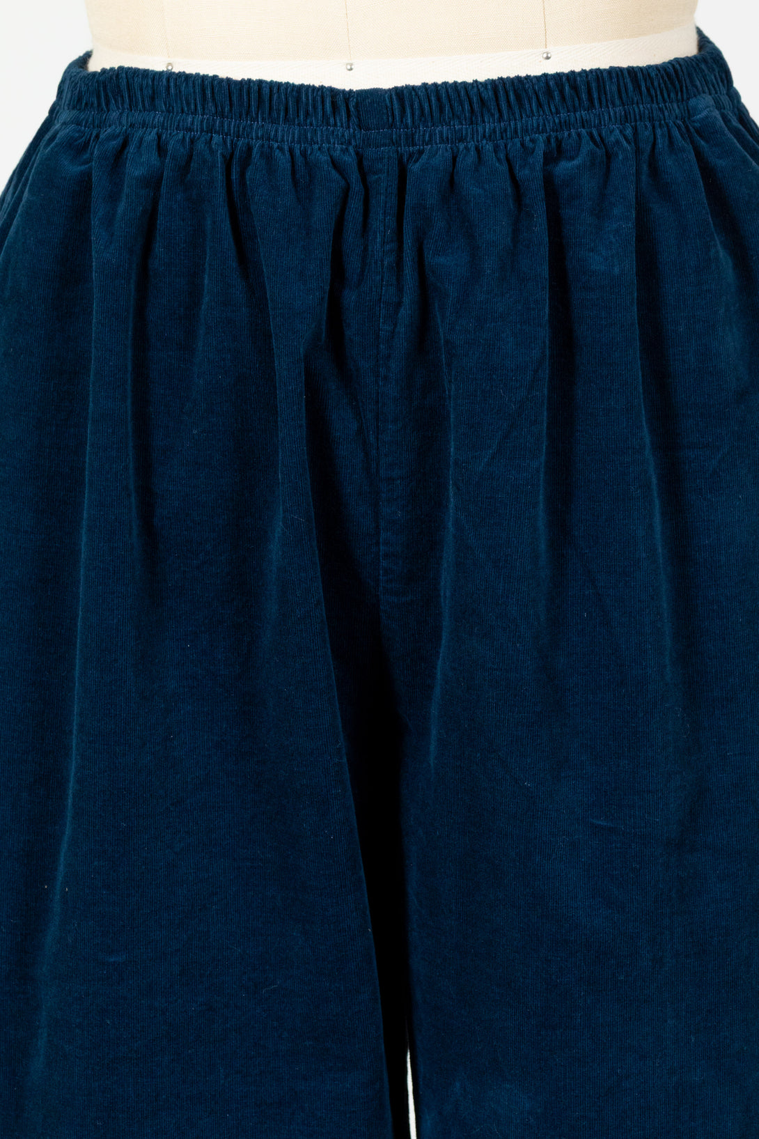 Crafted from luxe mini corduroy in a rich blue hue, the Lantern Pant by Cut Loose offers a chic, wide-legged silhouette with tapered ankles for a modern, flattering fit. Designed with an elastic waistband for effortless comfort, these pants feature angled seaming at the lower legs, creating a subtle lantern shape at the ankles. Invisible on-seam side pockets and a cropped length make this versatile piece perfect for dressing up or down, while the lightweight fabric ensures all-day ease and style.