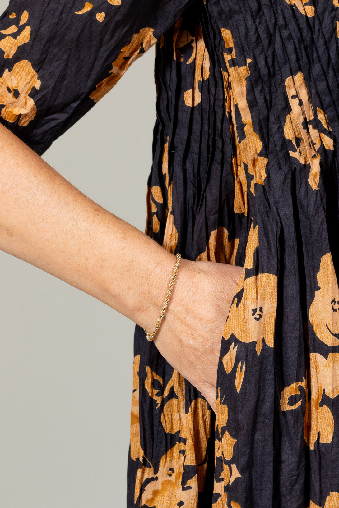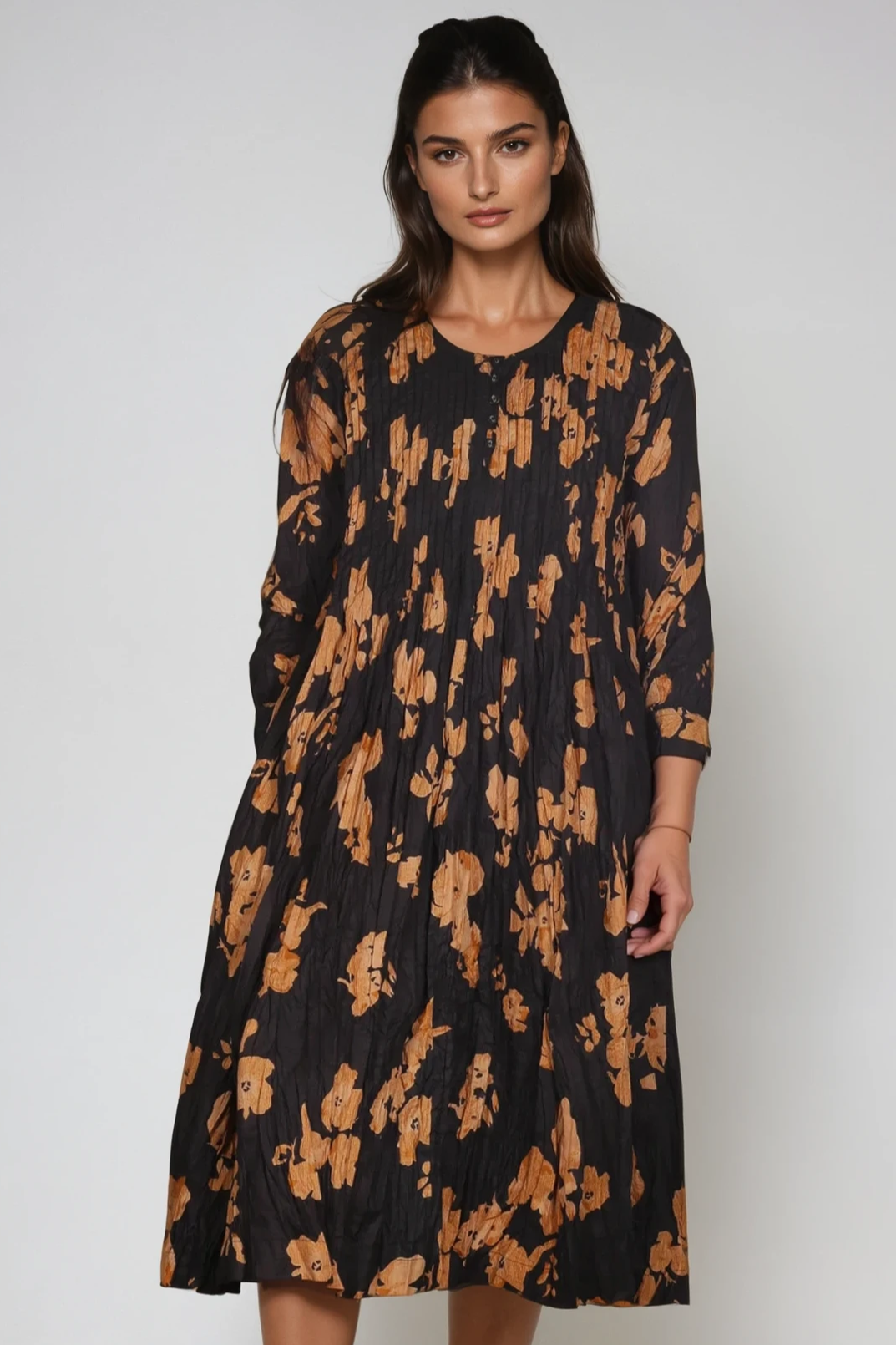 Dress Addict’s Juju Dress is crafted from soft, crinkled cotton with a banded neckline and delicate front pleats for a flattering fit-and-flare silhouette. Fully lined for comfort and structure, this versatile midi dress falls just below the knee and features convenient hip pockets. The rich fall bronze tones, accented by a deep black background, create a striking, seasonal look that transitions effortlessly from day-to-day wear to travel-ready style. A must-have piece for your autumn wardrobe.