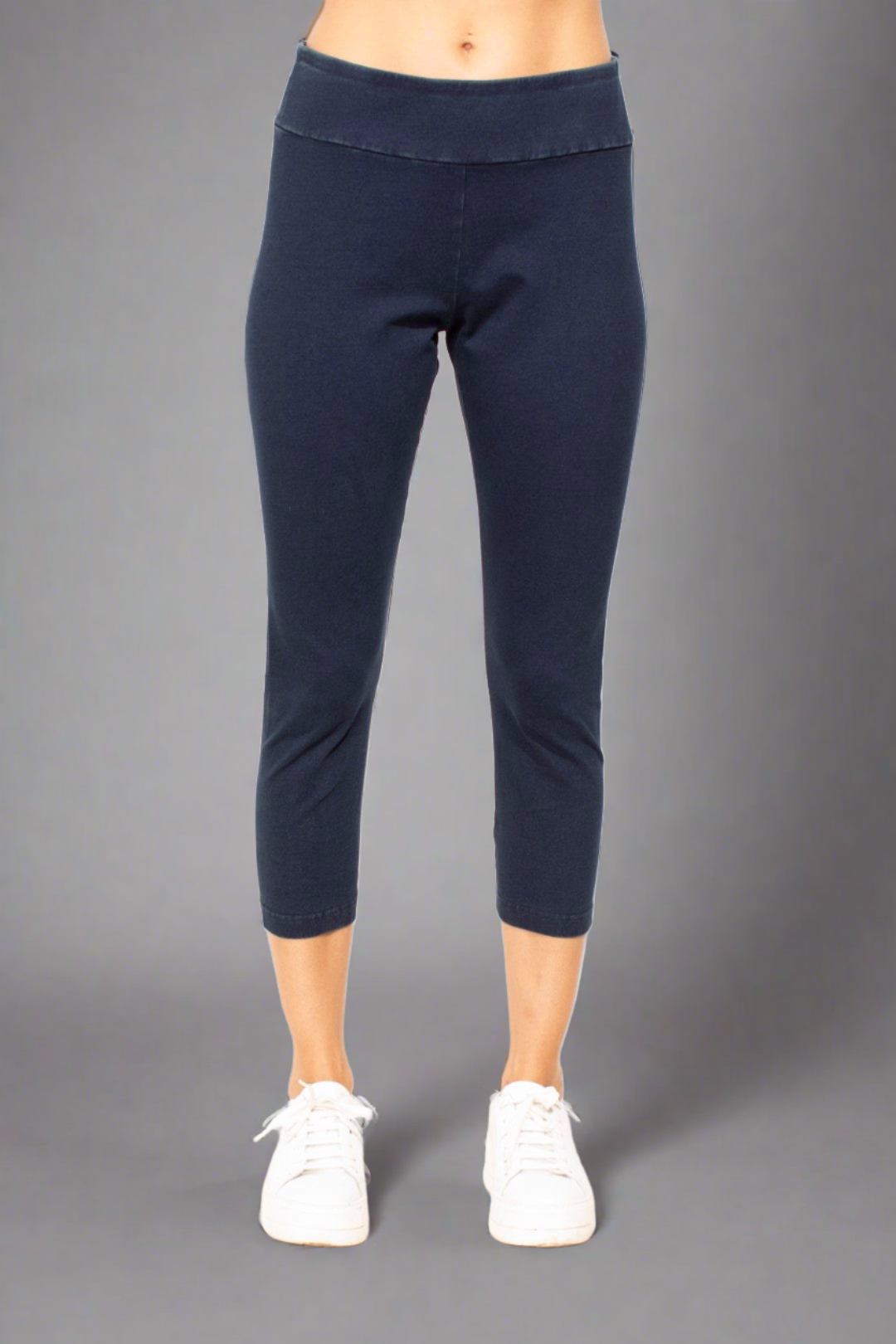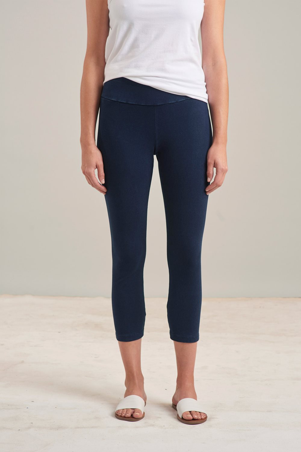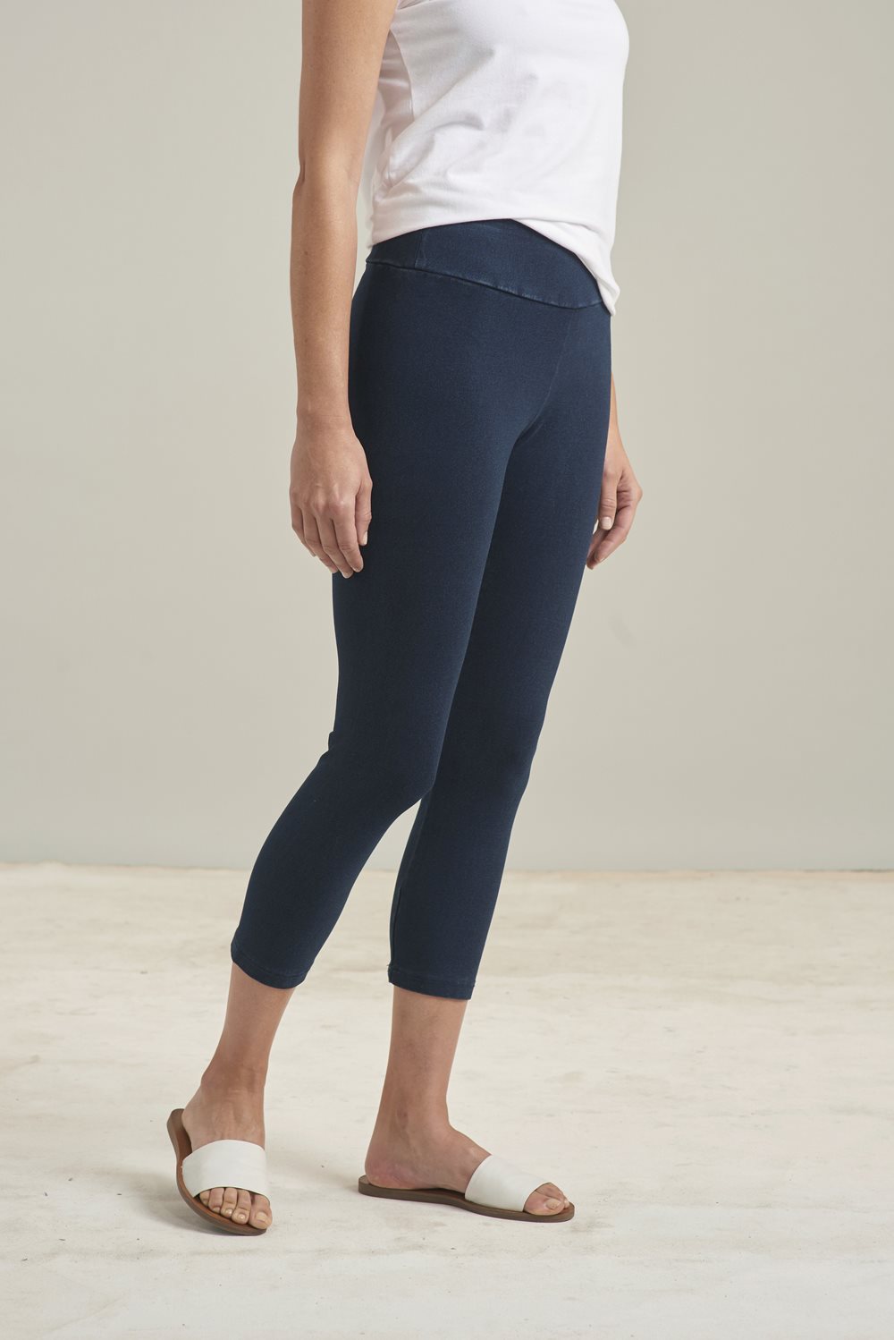 Habitat's Crop Pant is a pull on style jean/legging in a cropped, capri length.  It's sturdy and stretchy material is comfortable all day long, and holds the shape!  Extra wide elastic waistband won't roll down.  Clean lines with no pockets, easy to wear under tops and tunics. Falls below the knee to mid-shin on most.  Offered in Blue and Black stretch cotton with a denim style wash. *Note: These pants run generous, see measurements below, you may want to size down.