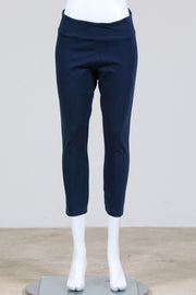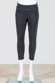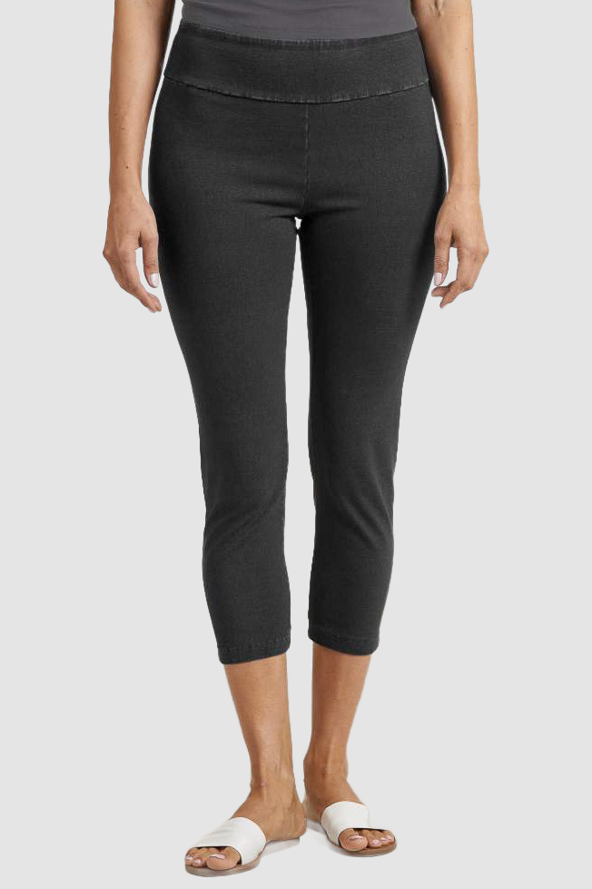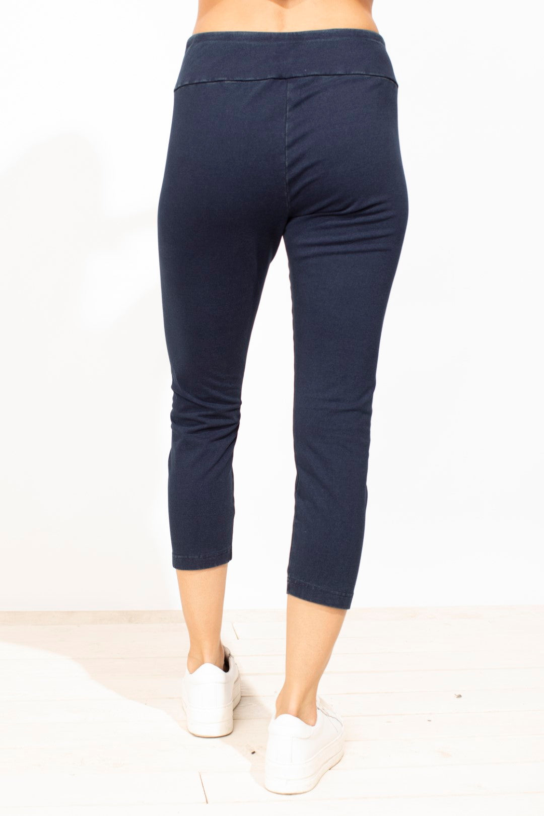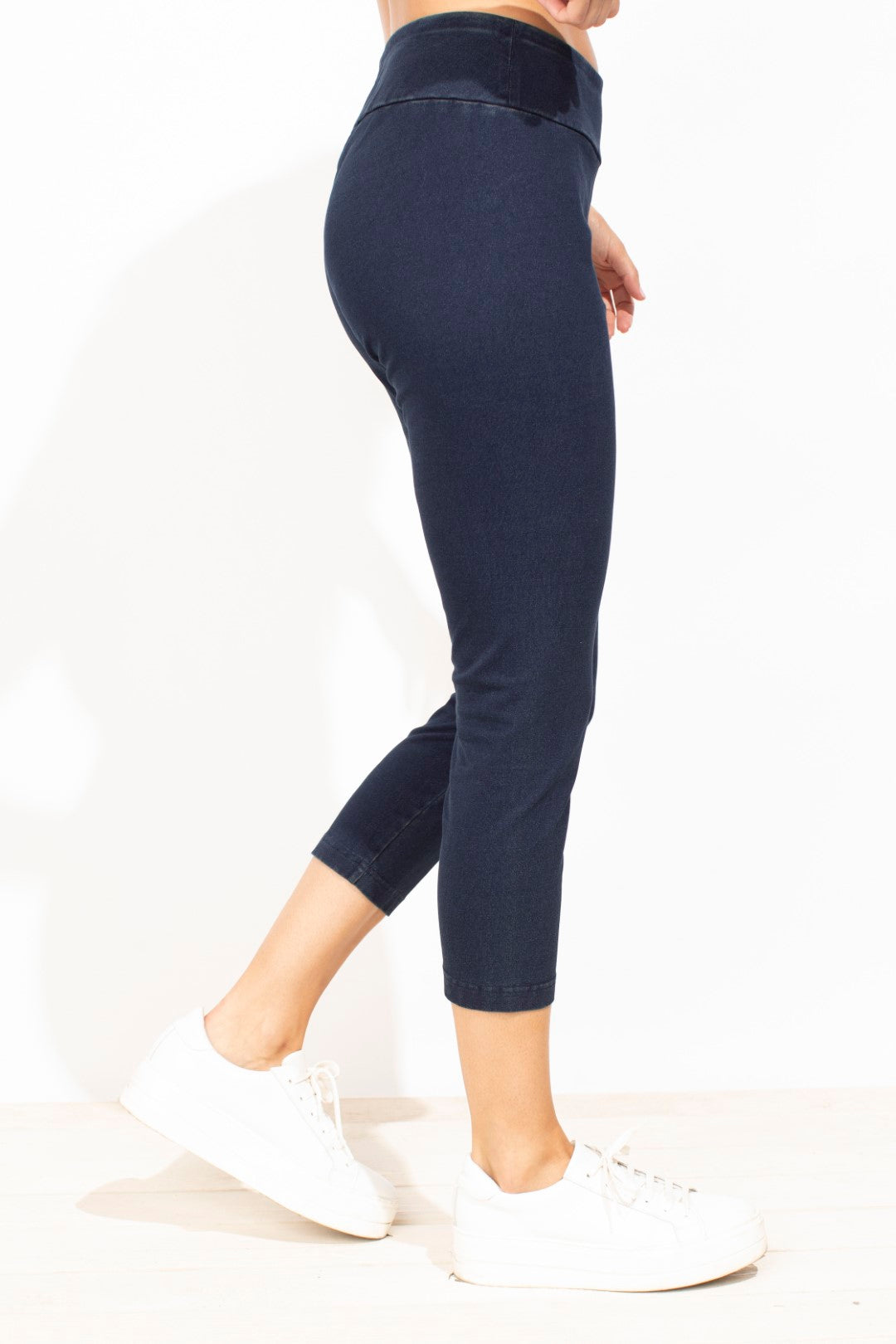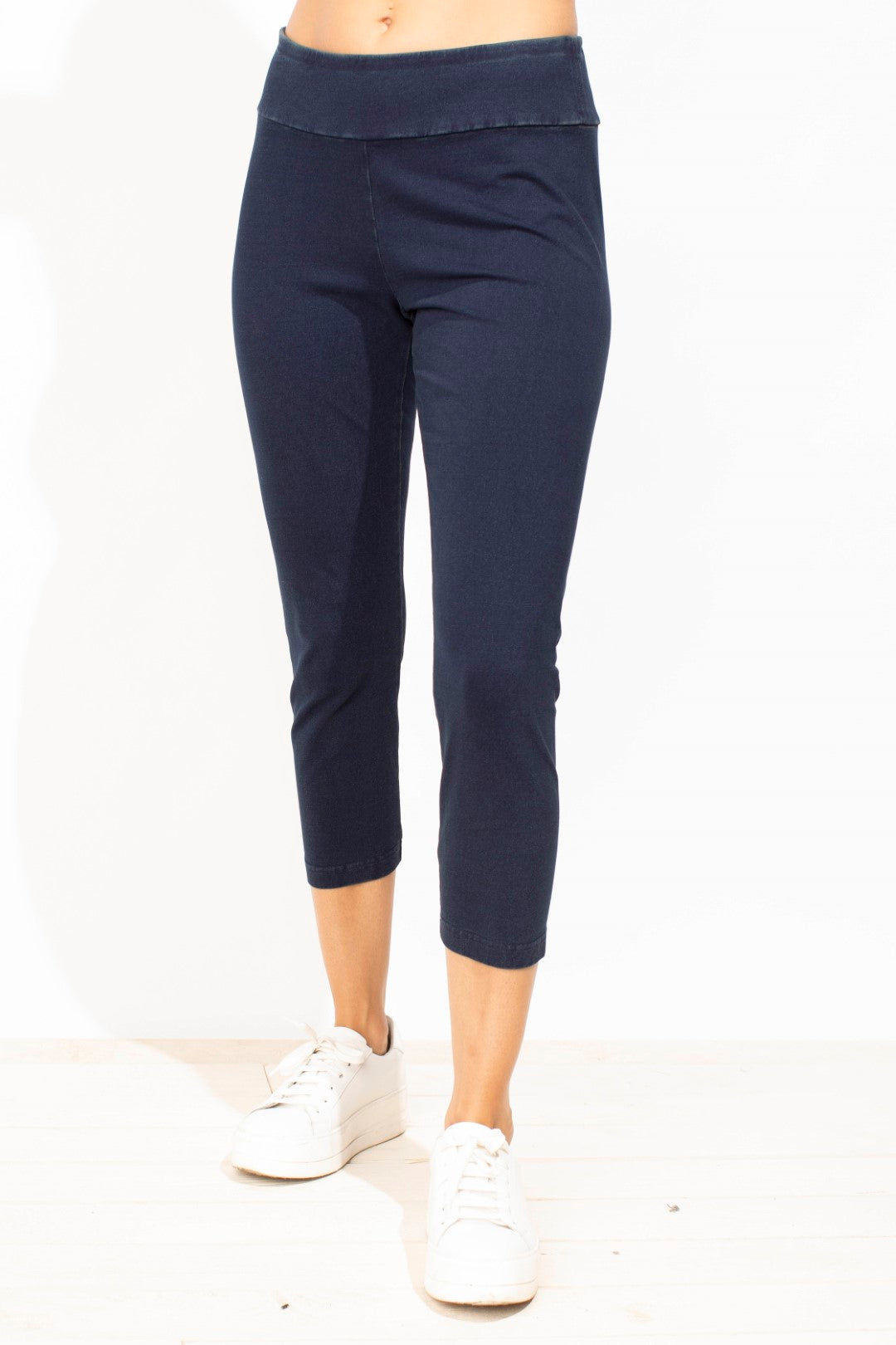 Habitat's Crop Pant is a pull on style jean/legging in a cropped, capri length.  It's sturdy and stretchy material is comfortable all day long, and holds the shape!  Extra wide elastic waistband won't roll down.  Clean lines with no pockets, easy to wear under tops and tunics. Falls below the knee to mid-shin on most.  Offered in Blue and Black stretch cotton with a denim style wash. *Note: These pants run generous, see measurements below, you may want to size down.