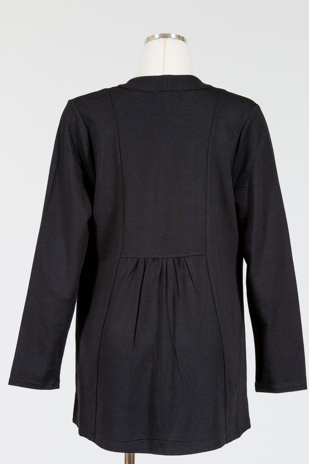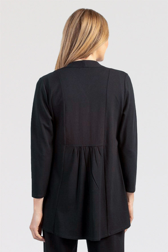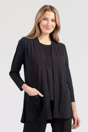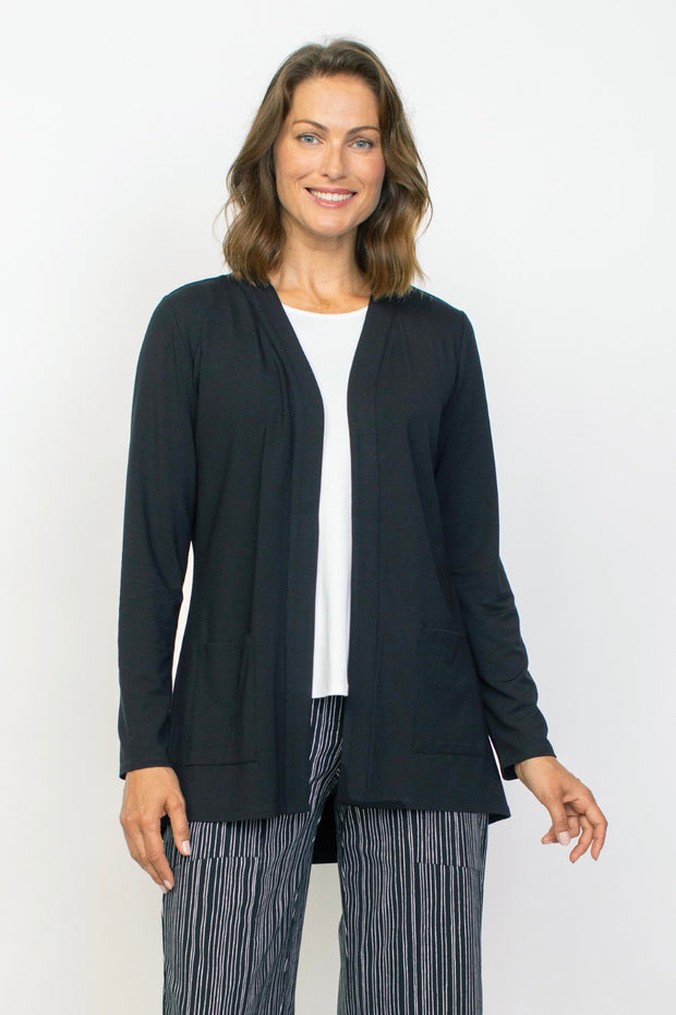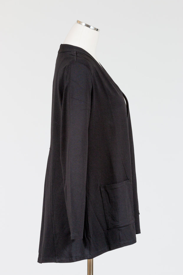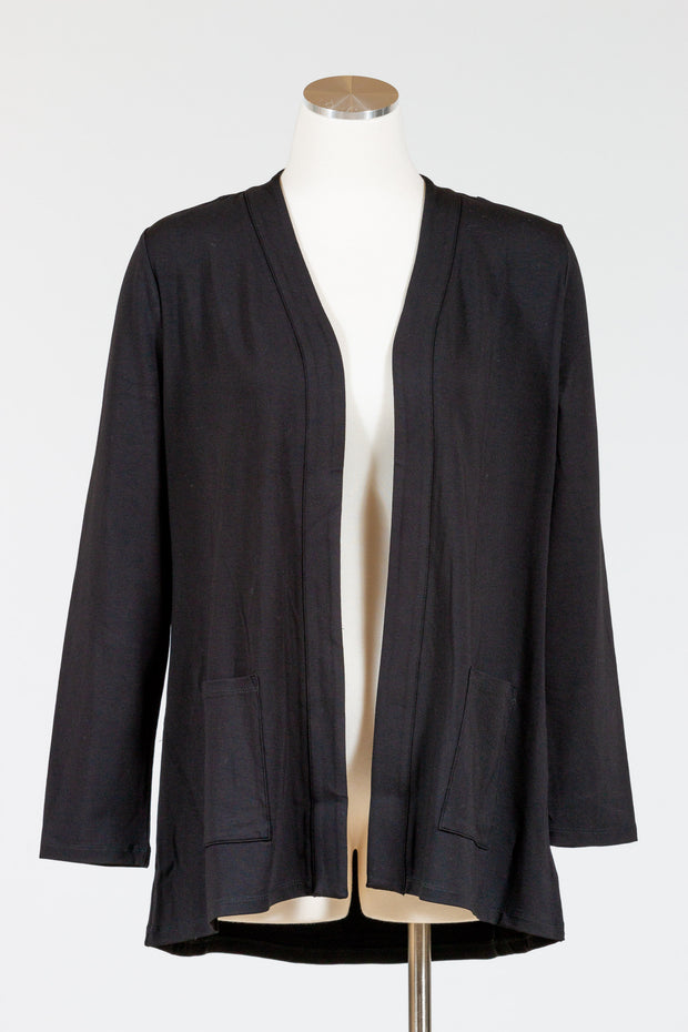 Habitat's Open Front Cardigan is the ideal cardigan topper for just about anything. Made in a super stretch fabric, this topper is super comfortable and travel ready. A draped front with two front patch pockets. Long sleeves are bracelet length. Falls over the hips, with a straight hemline. Backside has a dropped waist with a bit of ruching for volume.