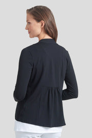 The Short Shirred Back Jacket from Habitat embodies timeless style. It features an open front with convenient pockets on each side and sleeves that rest just above the wrist. The back showcases a panel extending from the top to mid-back, gathering into a stylish ruching near the bottom. Typically falling just below the waist, this jacket is destined to be your go-to favorite for effortless style and comfort. Made in a comfortable black jersey. Part of Habitat's Core Travel Collection.
