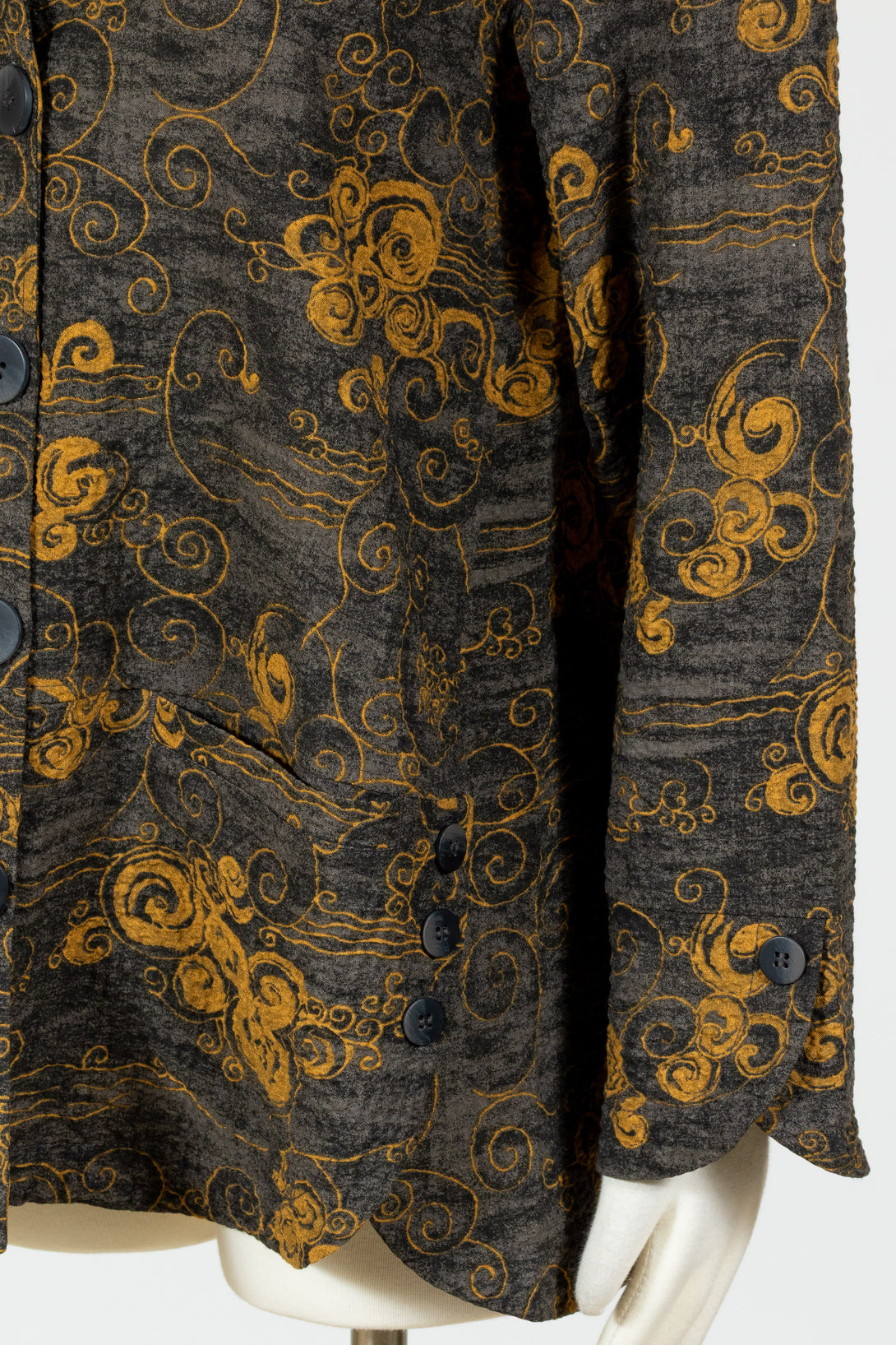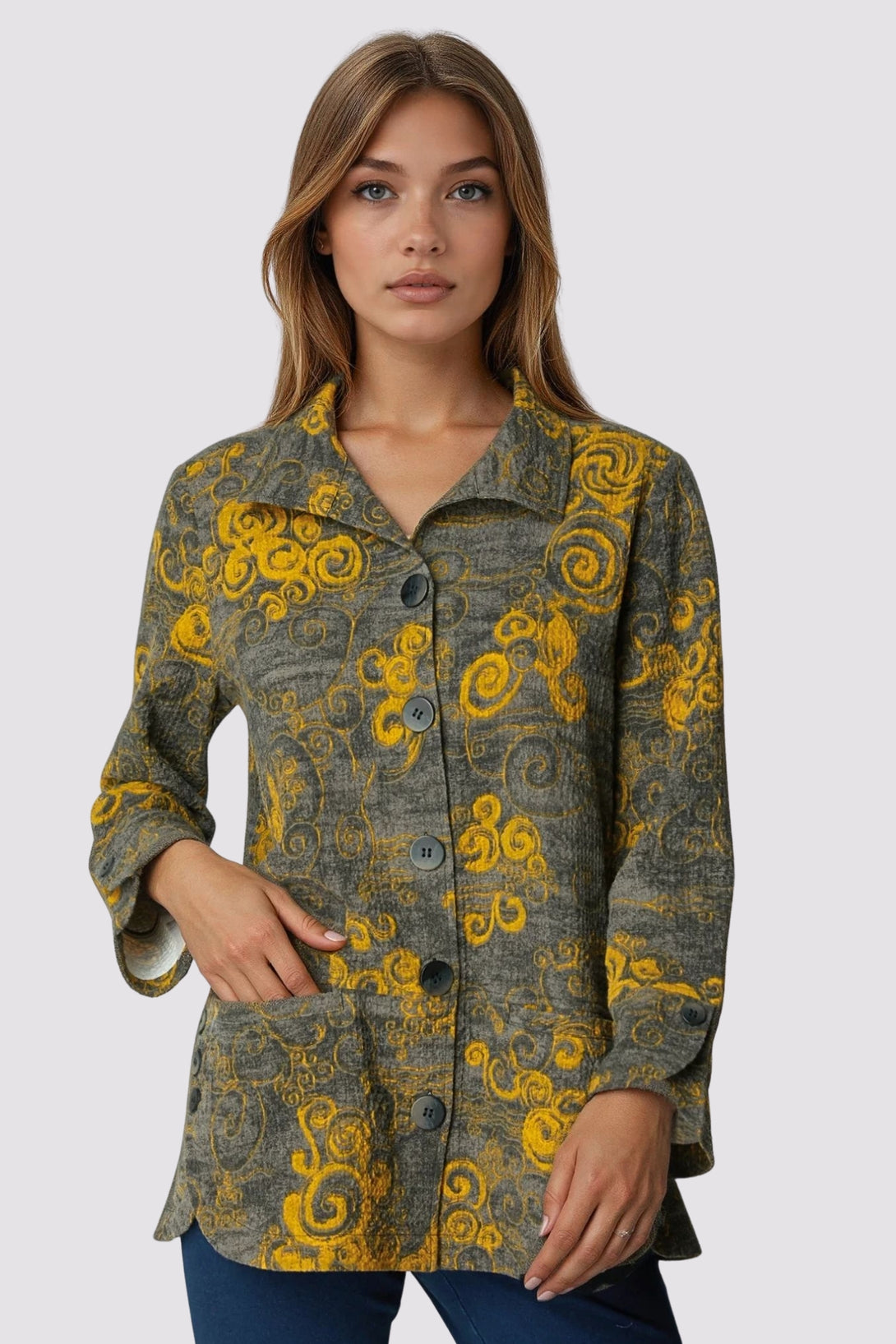 The Tulip Swing Jacket by Habitat is a sturdy, puckered shirt jacket with an abstract pattern. It features rounded cuffs with faux buttons, two hip pockets set beside curved split hems for added movement, and a three-button detail on each side. A structured collar and a beautiful golden abstract scroll pattern—almost metallic in appearance—give it a distinctive look. Faded black base. Fabric is woven with a bit of stretch for comfort. A perfect statement piece for fall.