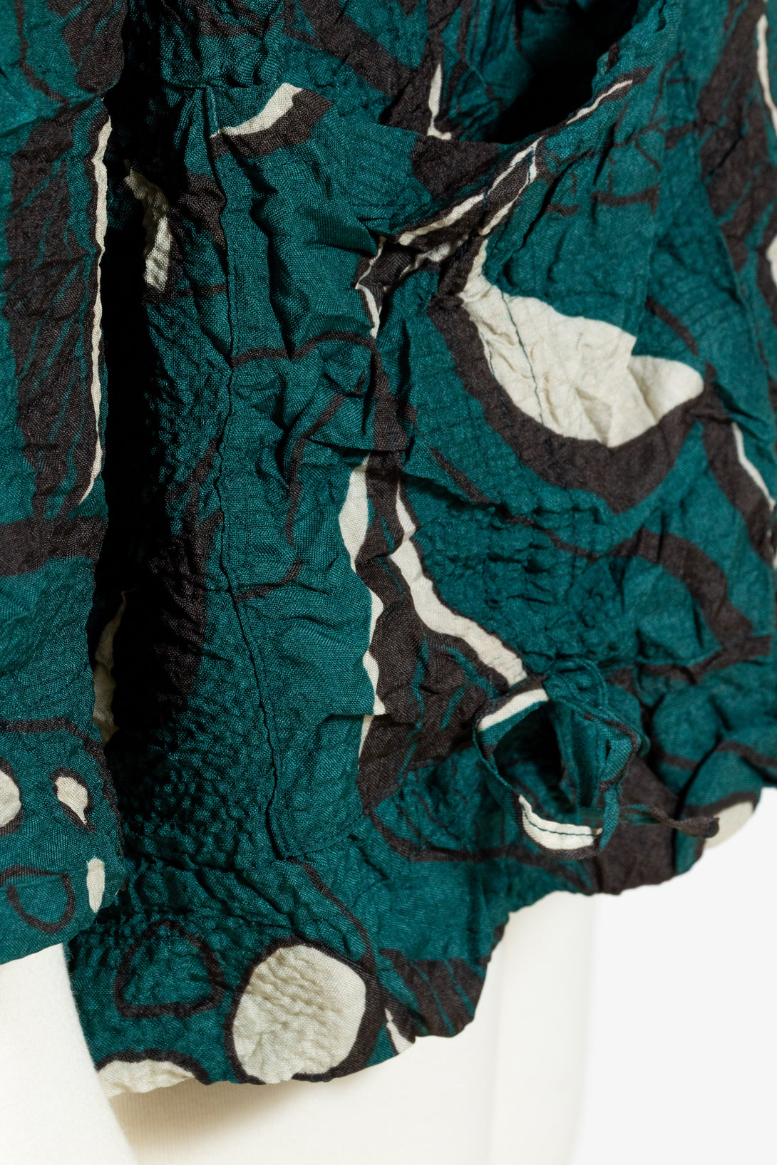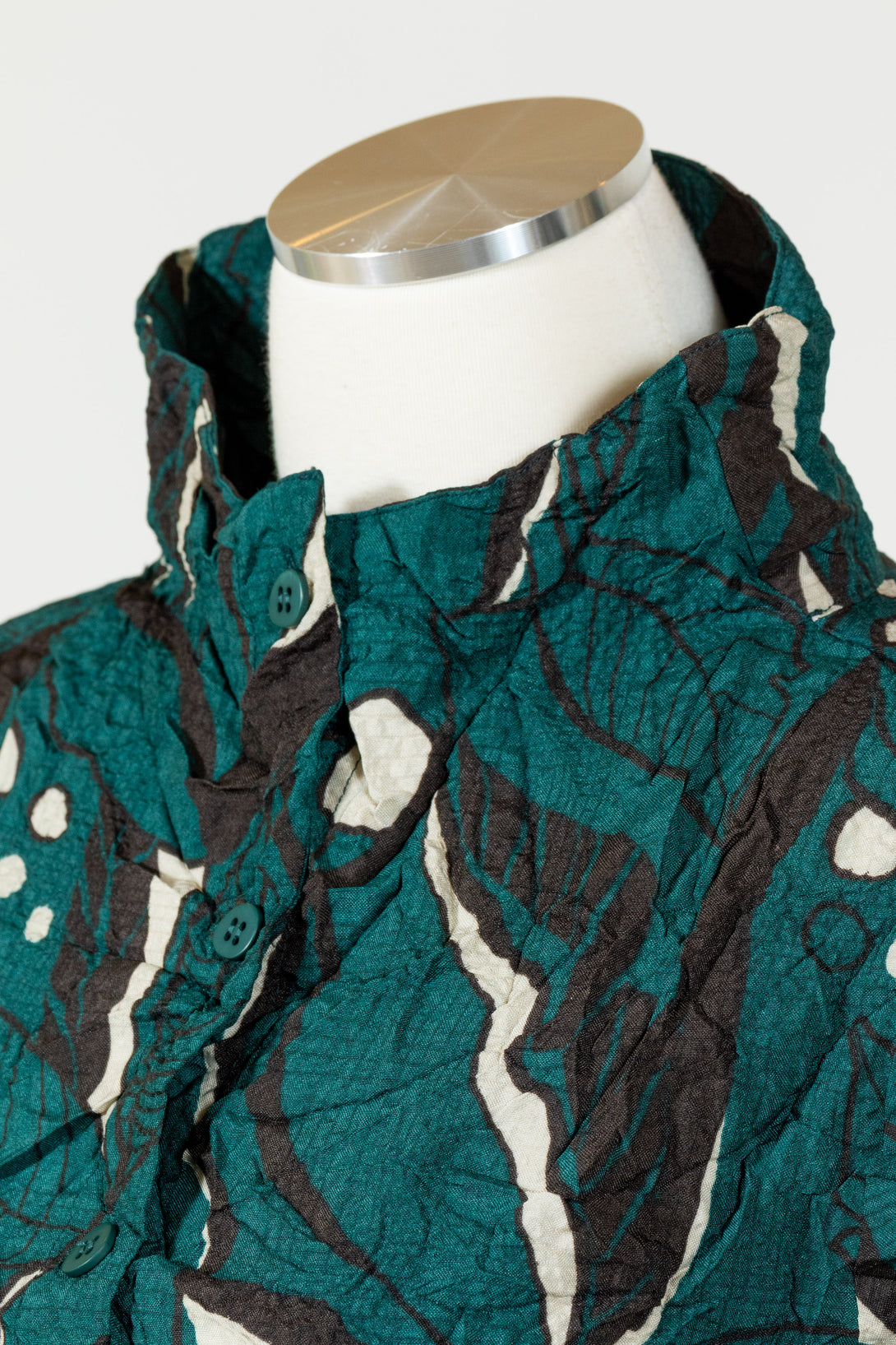 The Cinched Pocket Top by Olivia by Habitat, part of the Crepe de Chine collection, is crafted from a travel-friendly crushed fabric with dimensional texture and depth. Designed with a high neckline that folds over for a collared look, three-quarter length sleeves, and a button-front closure, it features a right-front pocket with a drawstring detail for a stylish cinched effect. The rich deep green background, accented by abstract black and cream brushstroke leaves, adds an artistic touch to this versatile, packable piece.