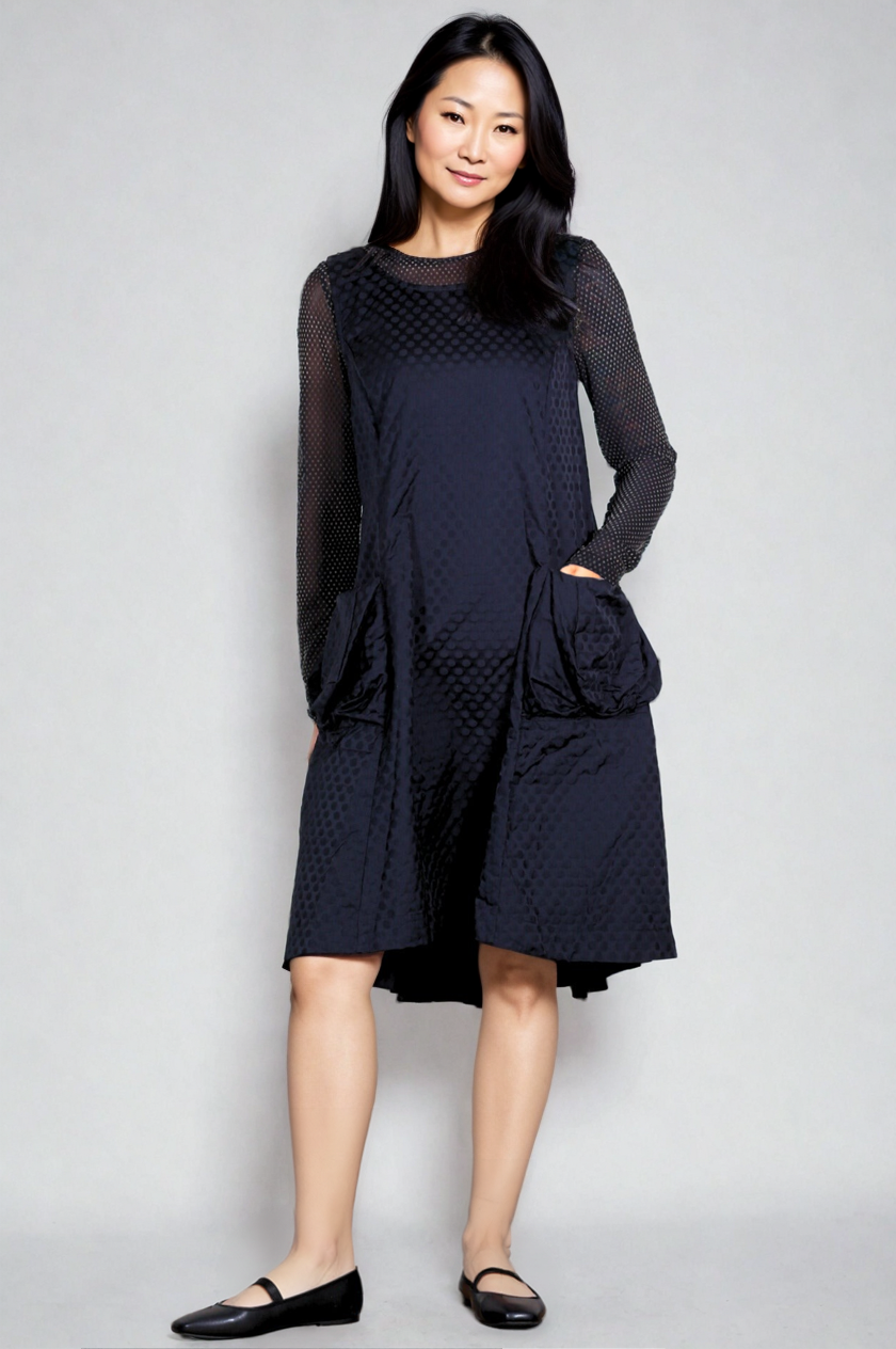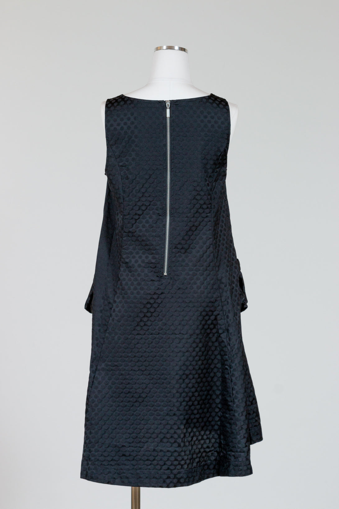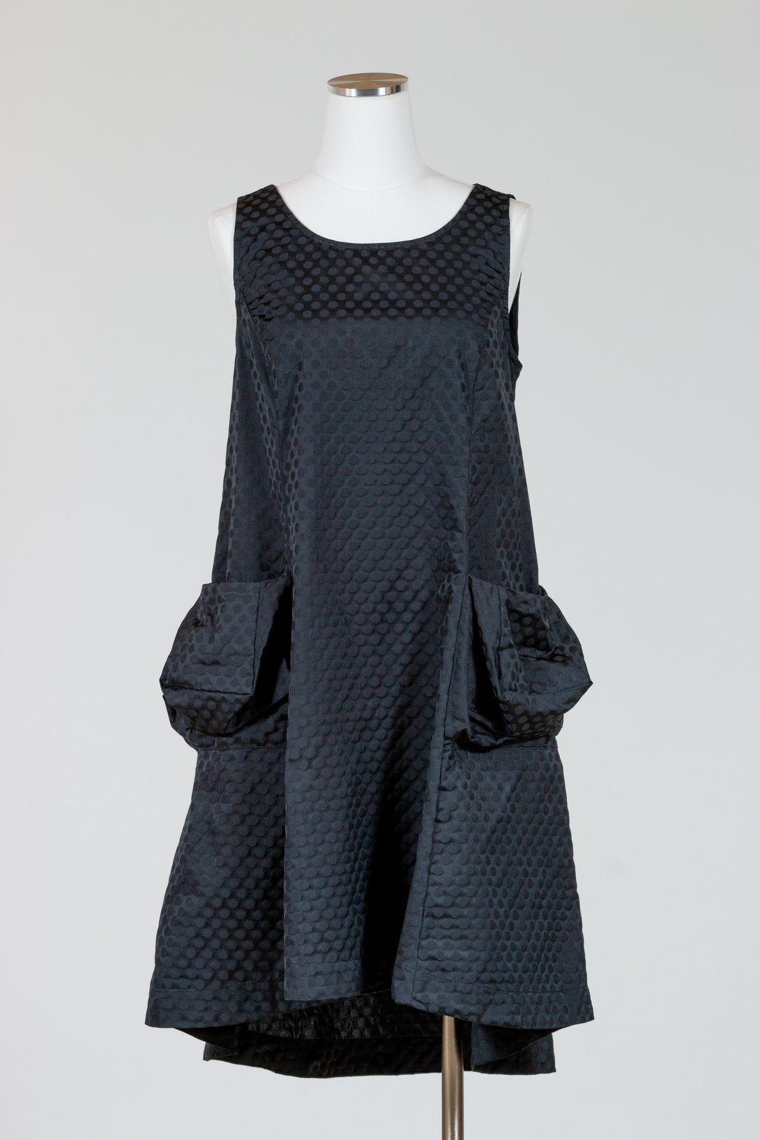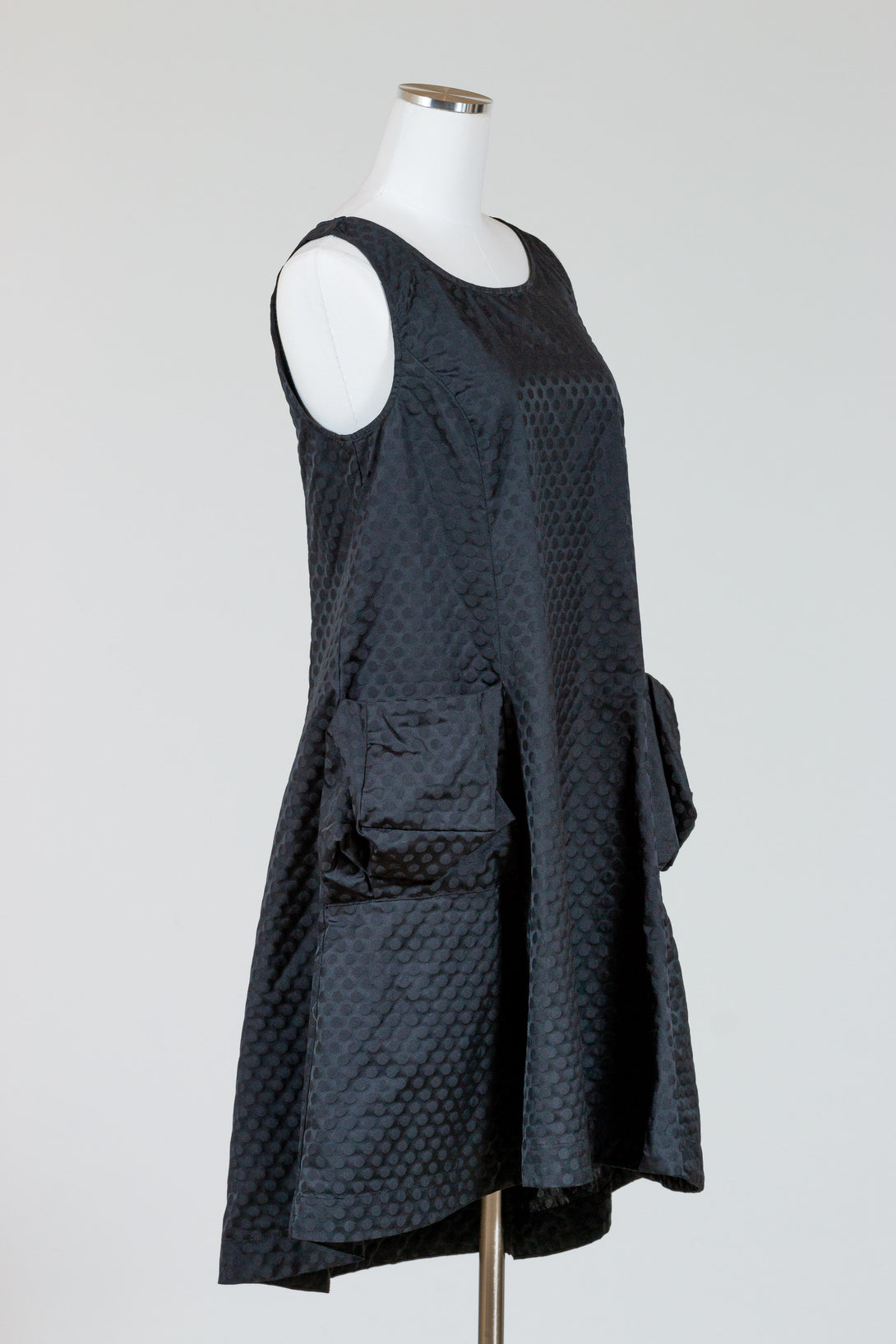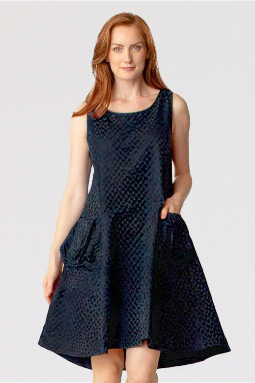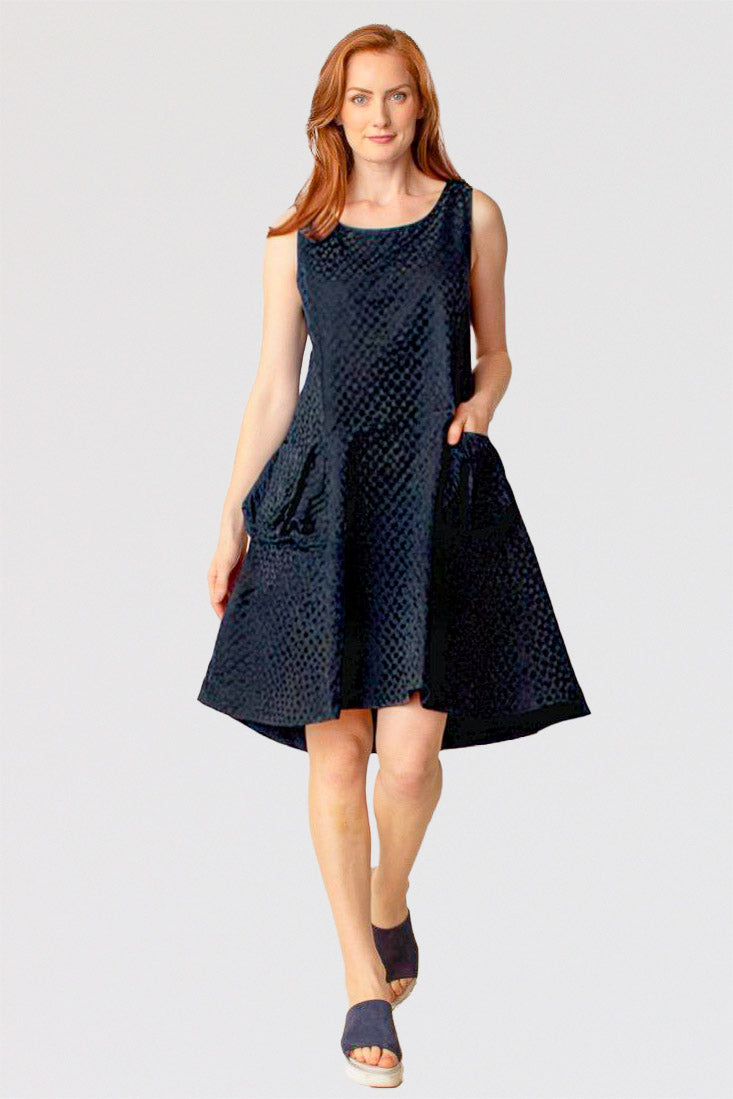 Liv by Habitat's Perfect Sculpt Artist Dressis a sleeveless, fit and flareddress with a zip up back. Made in a crisp, polka dot damask pattern for a subtle texture. A-line shape flares and falls a bit longer in the back. Two gathered patch pockets in the front.  Falls to just above the knee on most. Material is a brushed poly fabric that can be worn crinkled or smoothed out.