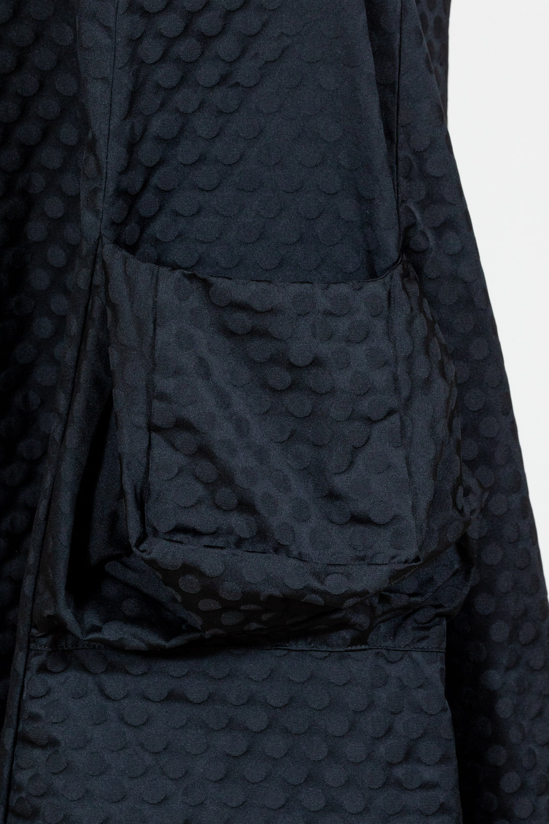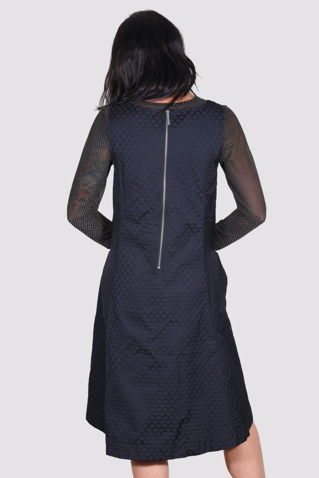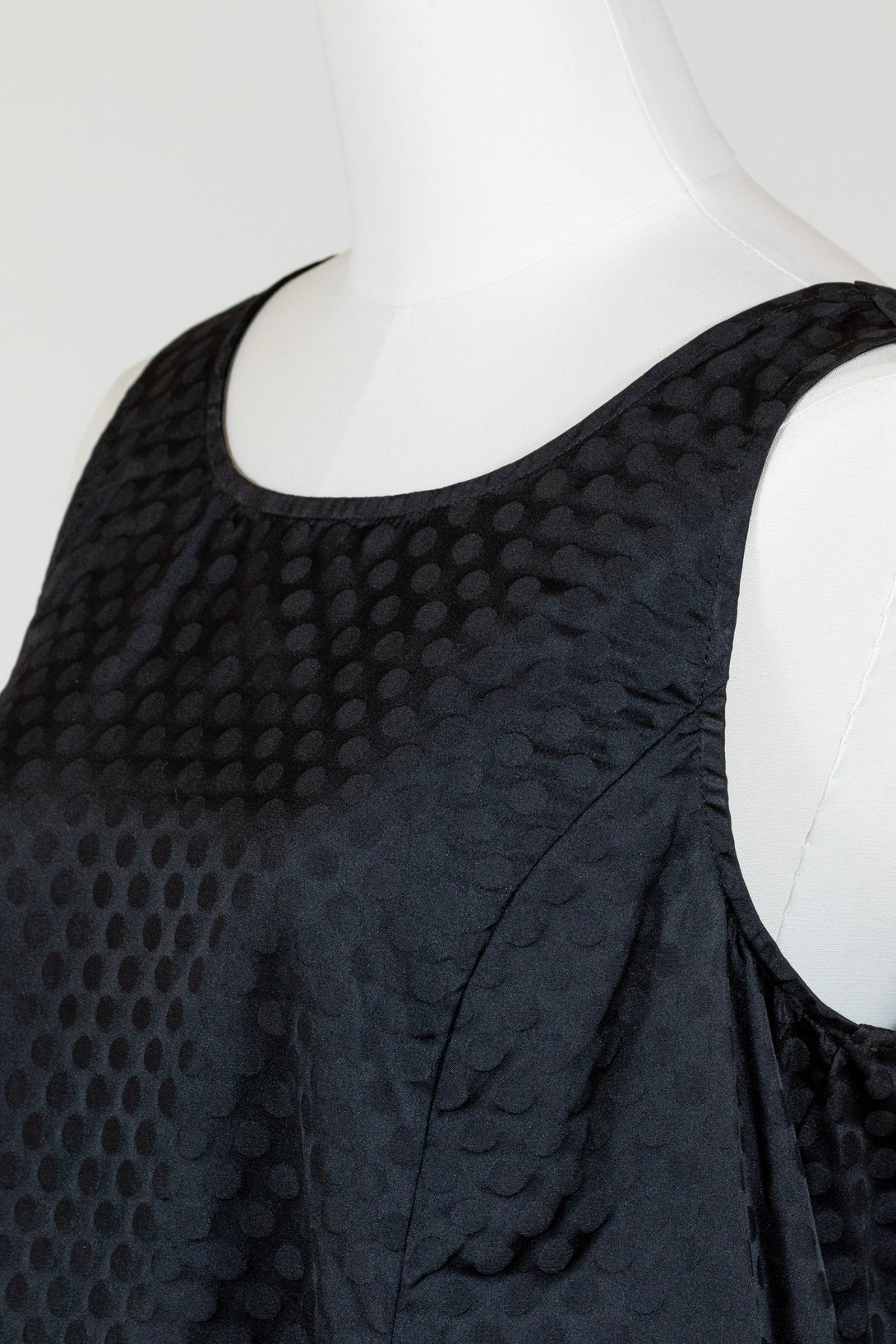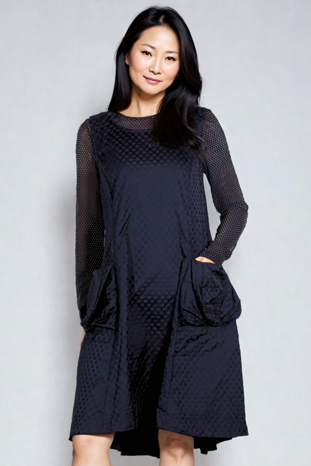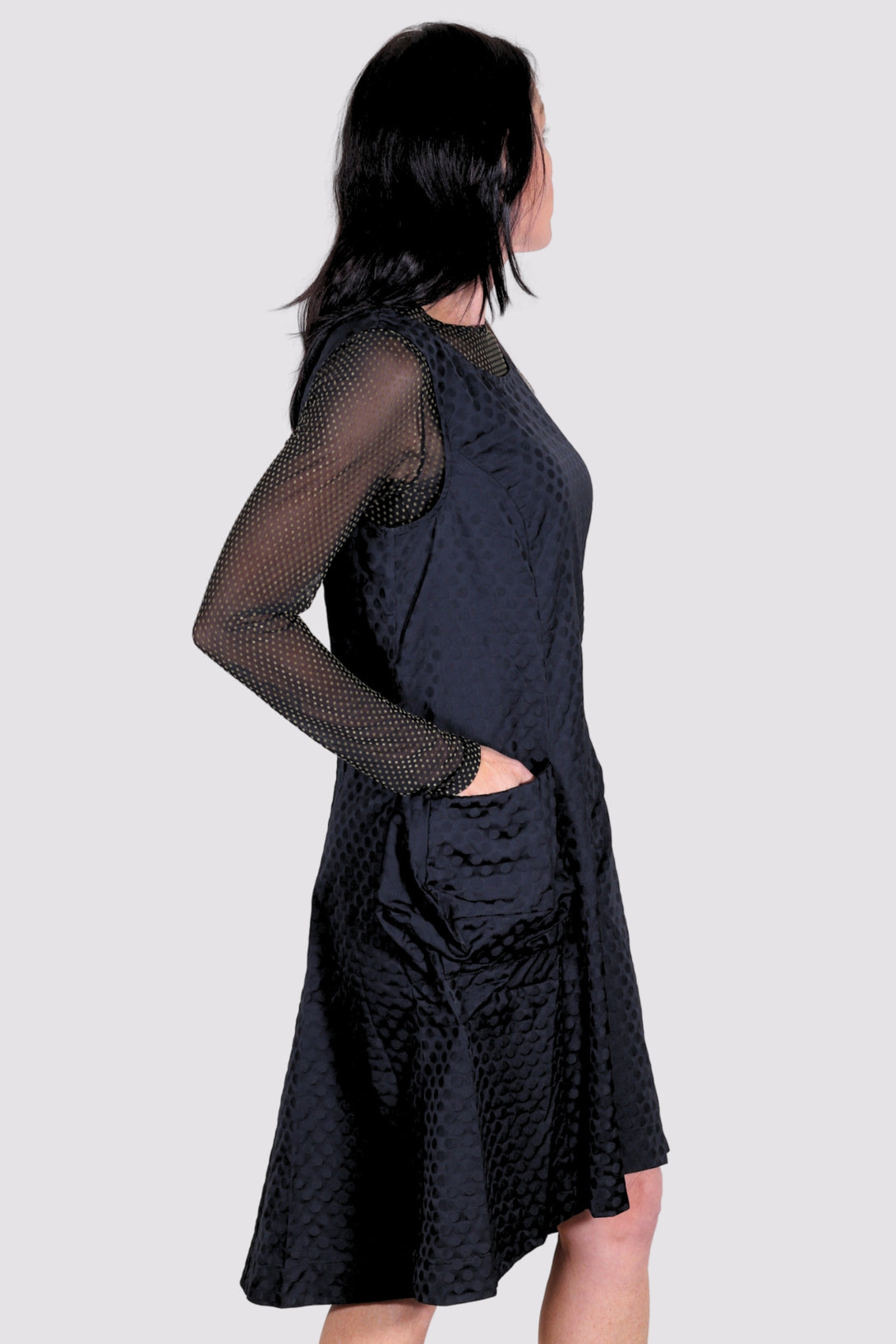 Liv by Habitat's Perfect Sculpt Artist Dressis a sleeveless, fit and flareddress with a zip up back. Made in a crisp, polka dot damask pattern for a subtle texture. A-line shape flares and falls a bit longer in the back. Two gathered patch pockets in the front.  Falls to just above the knee on most. Material is a brushed poly fabric that can be worn crinkled or smoothed out.
