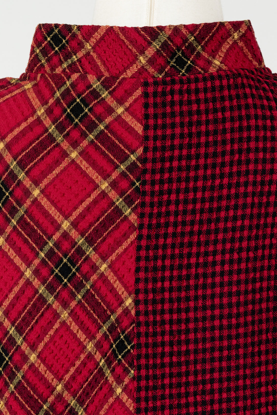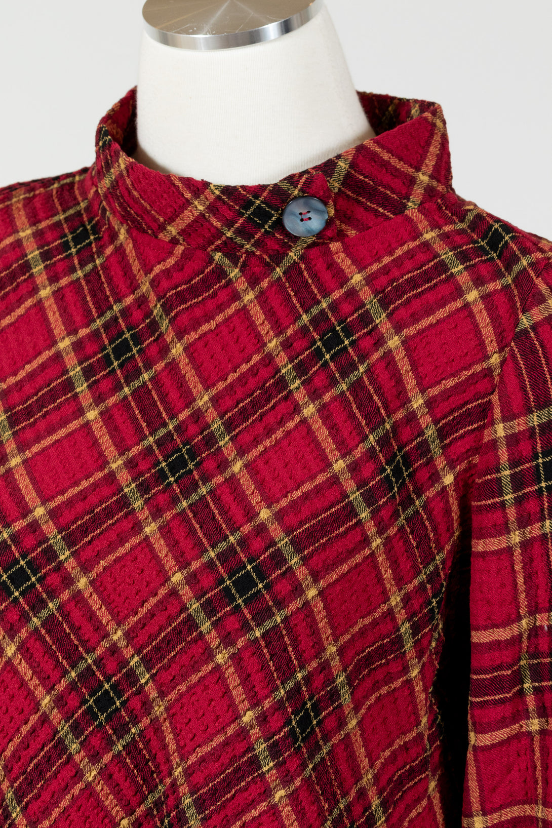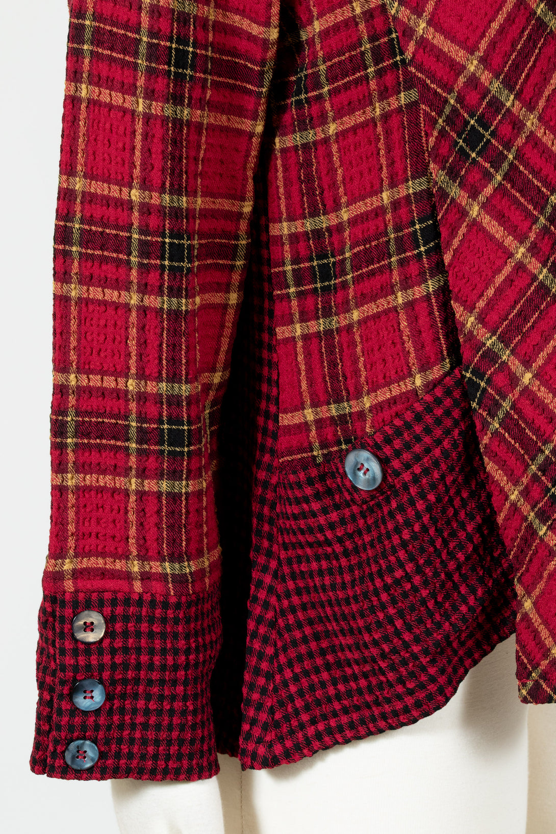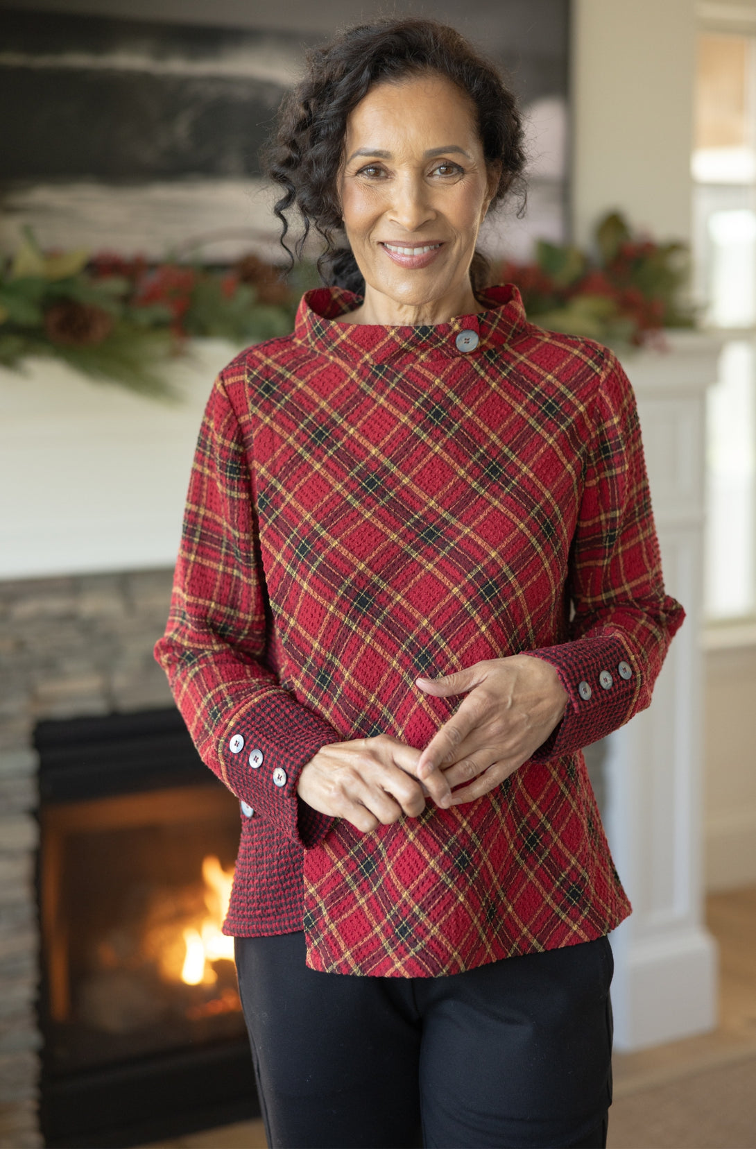 The Habitat Asymmetrical Button Cuff Top gives casual style a modern twist with its asymmetrical hem and unique details. Playful mixed plaids at the cuffs, side pocket, and back add eye-catching contrast, while a short open mock collar with faux button accents lends a refined touch. This long-sleeve top is comfortable, versatile, and effortlessly chic—perfect with jeans or skirts for a laid-back look that stands out. Offered in mixed red check and plaid, perfectly festive for the holiday season!