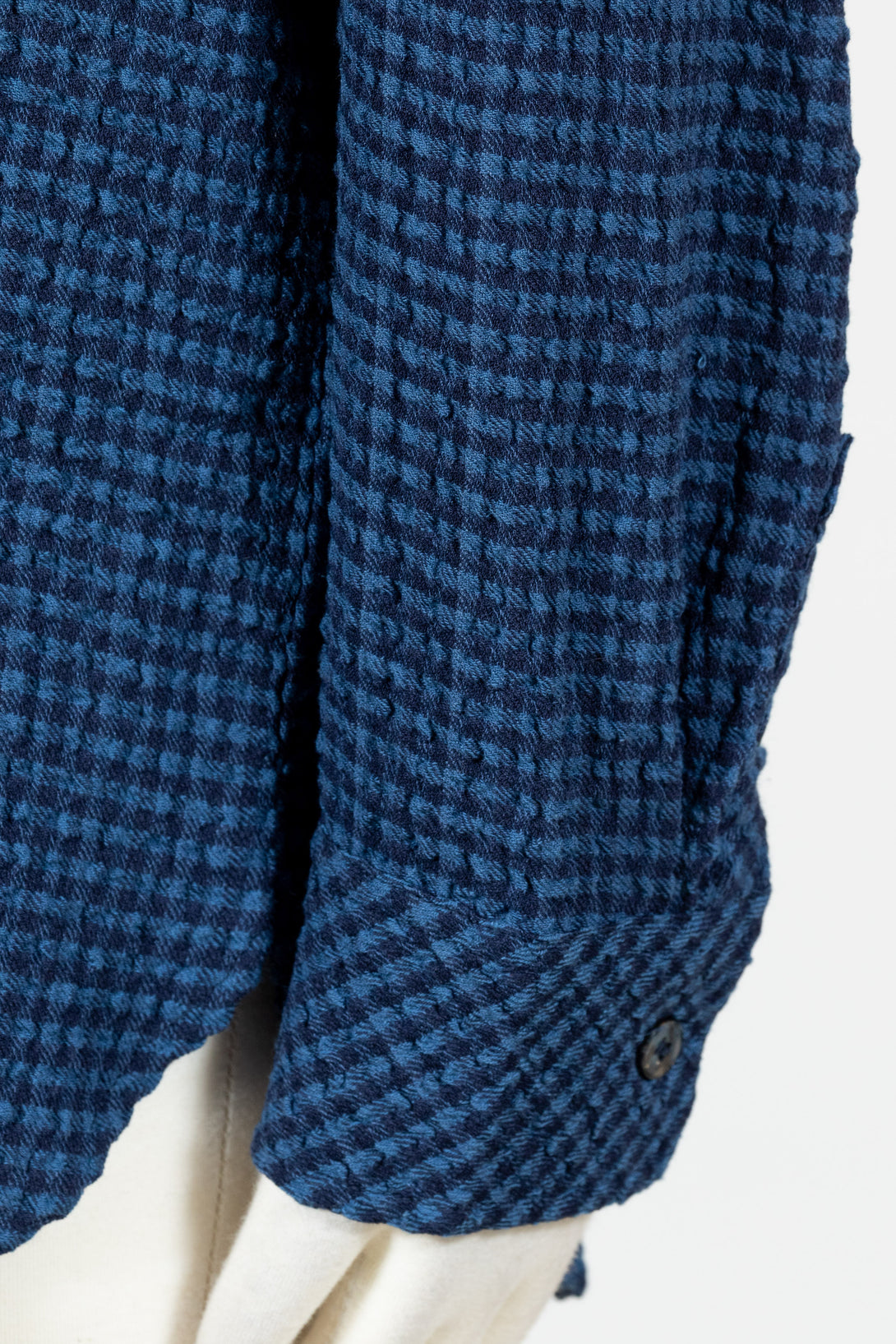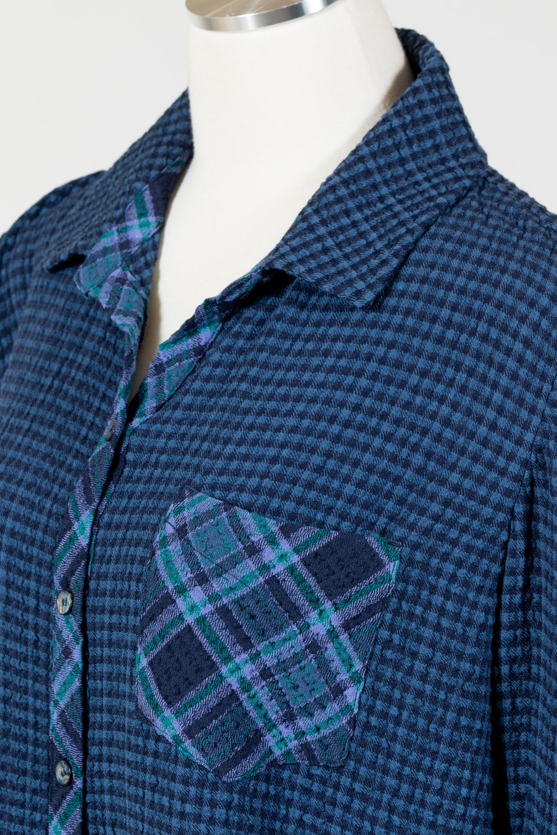 Habitat Girl Gone Plaid Boyfriend Pocket Shirt front view in soft crinkled check fabric with contrasting plaid pocket and button placket