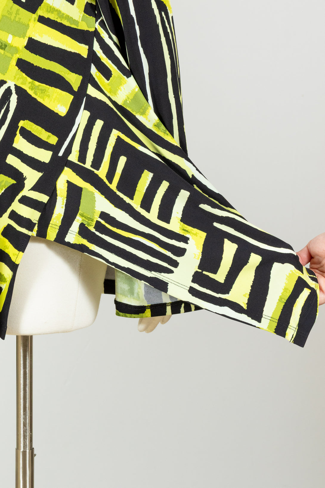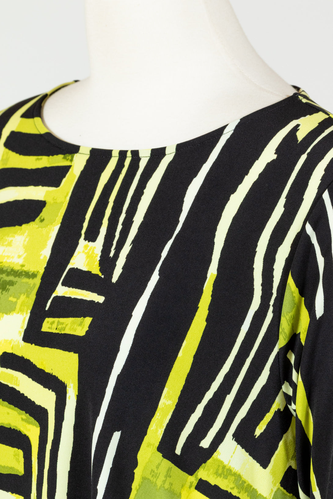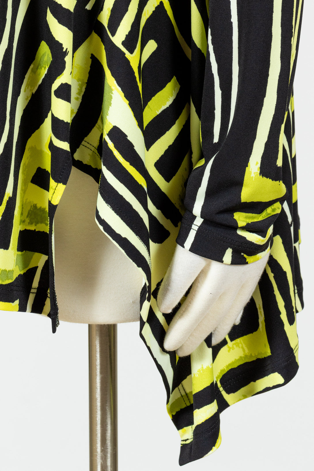 The Reanna Top by Chalet features a wide round neckline, long sleeves, and an asymmetrical hemline that drapes over the hips on both sides, creating a flattering flounce on the A-line silhouette. Made in a stretch jersey with a bold geometric print of black and vibrant green tones, this swingy top offers effortless elegance with a smooth, relaxed fit. With no pockets, it’s perfect for layering or wearing on its own for a chic, polished look.