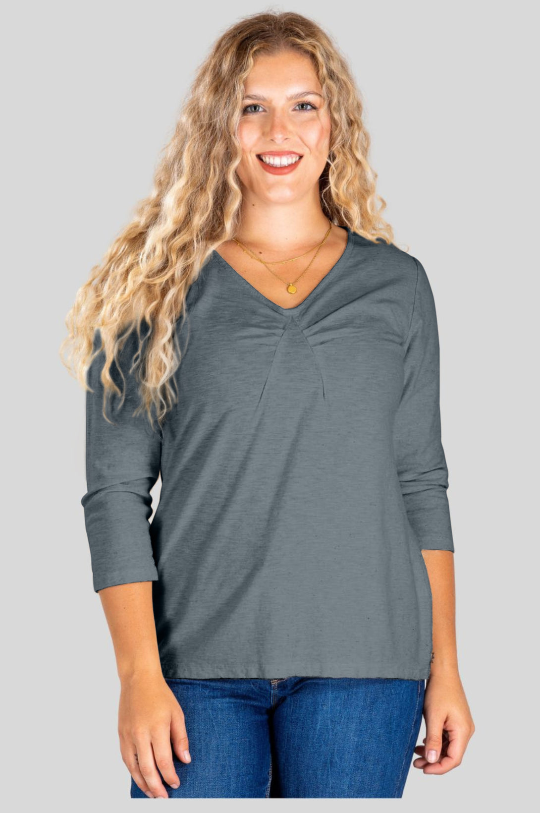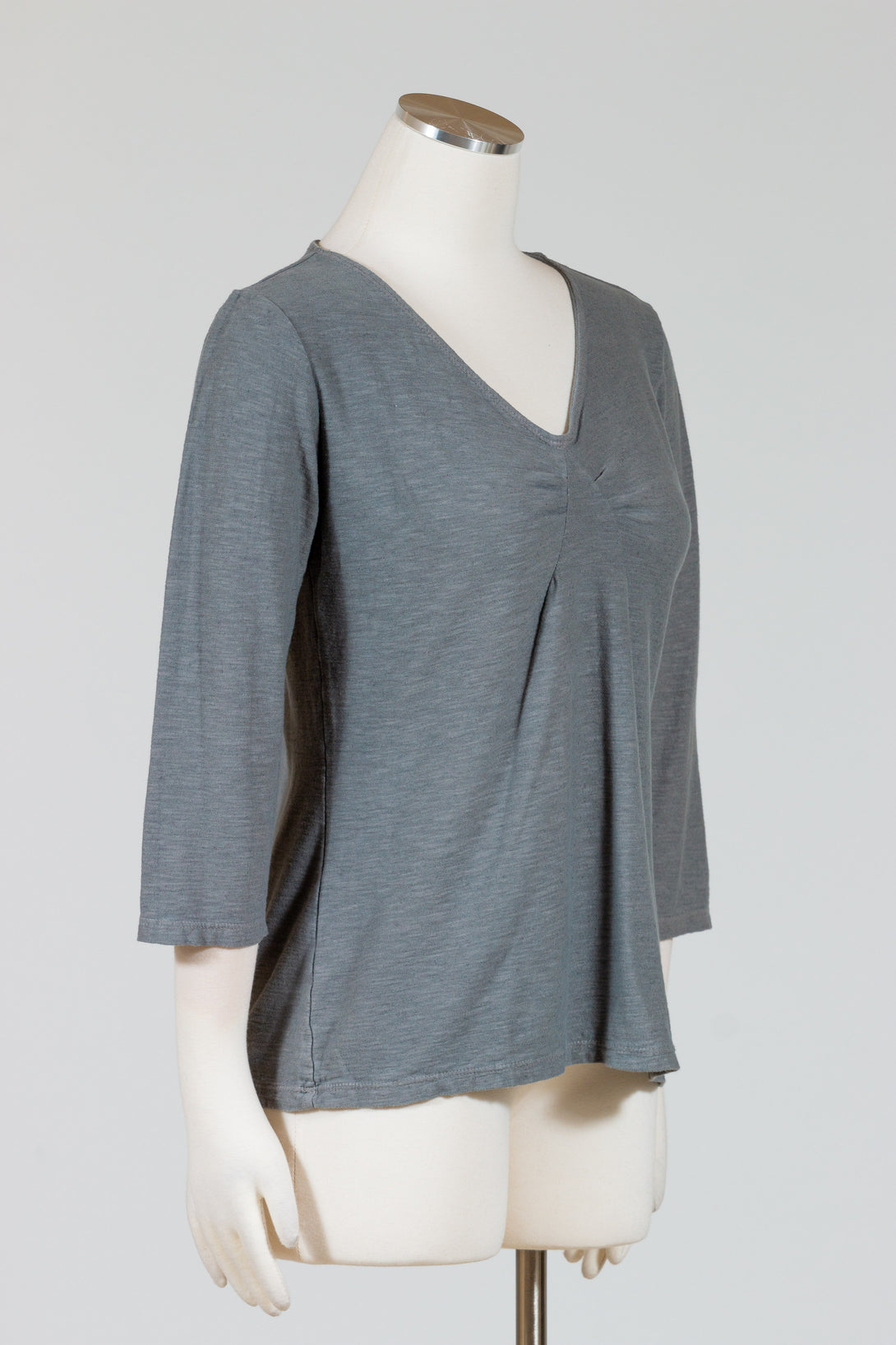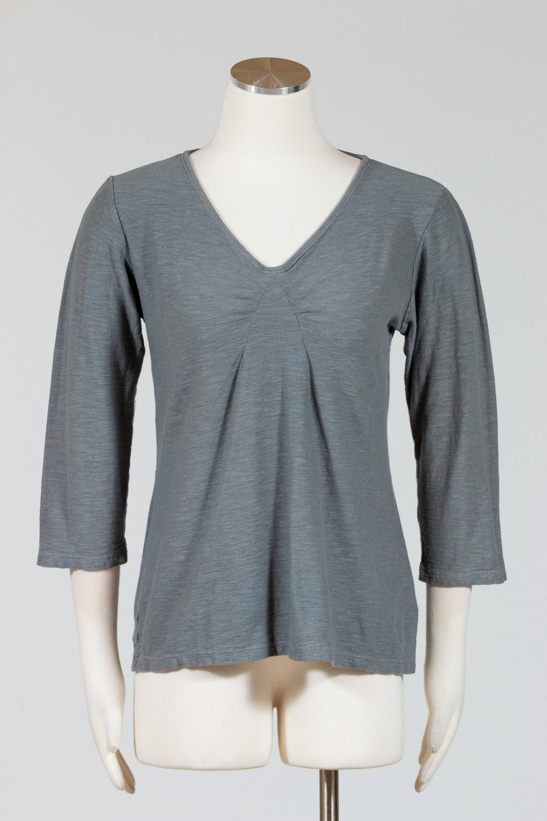 Cut Loose Tuck Front Tee has soft V-neck with a tucked bust detail and three-quarter length sleeves. This top has a trim fitting shape that gently falls at the hips. Made of cotton and linen knit fabric that is comfortable and breathable for all season dressing.