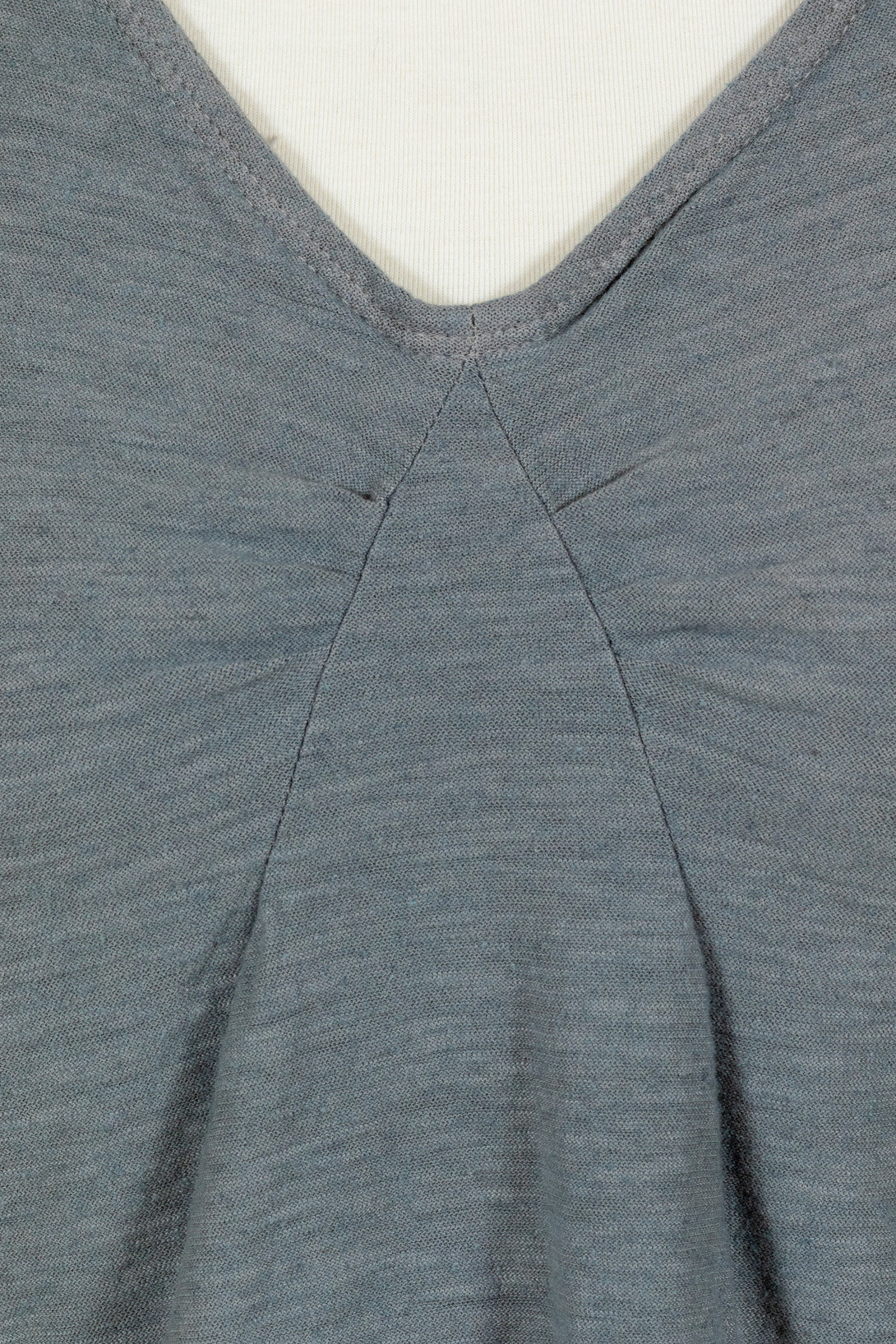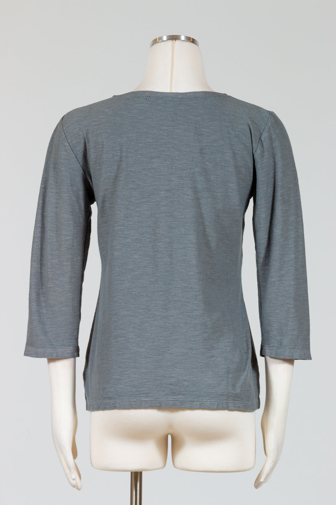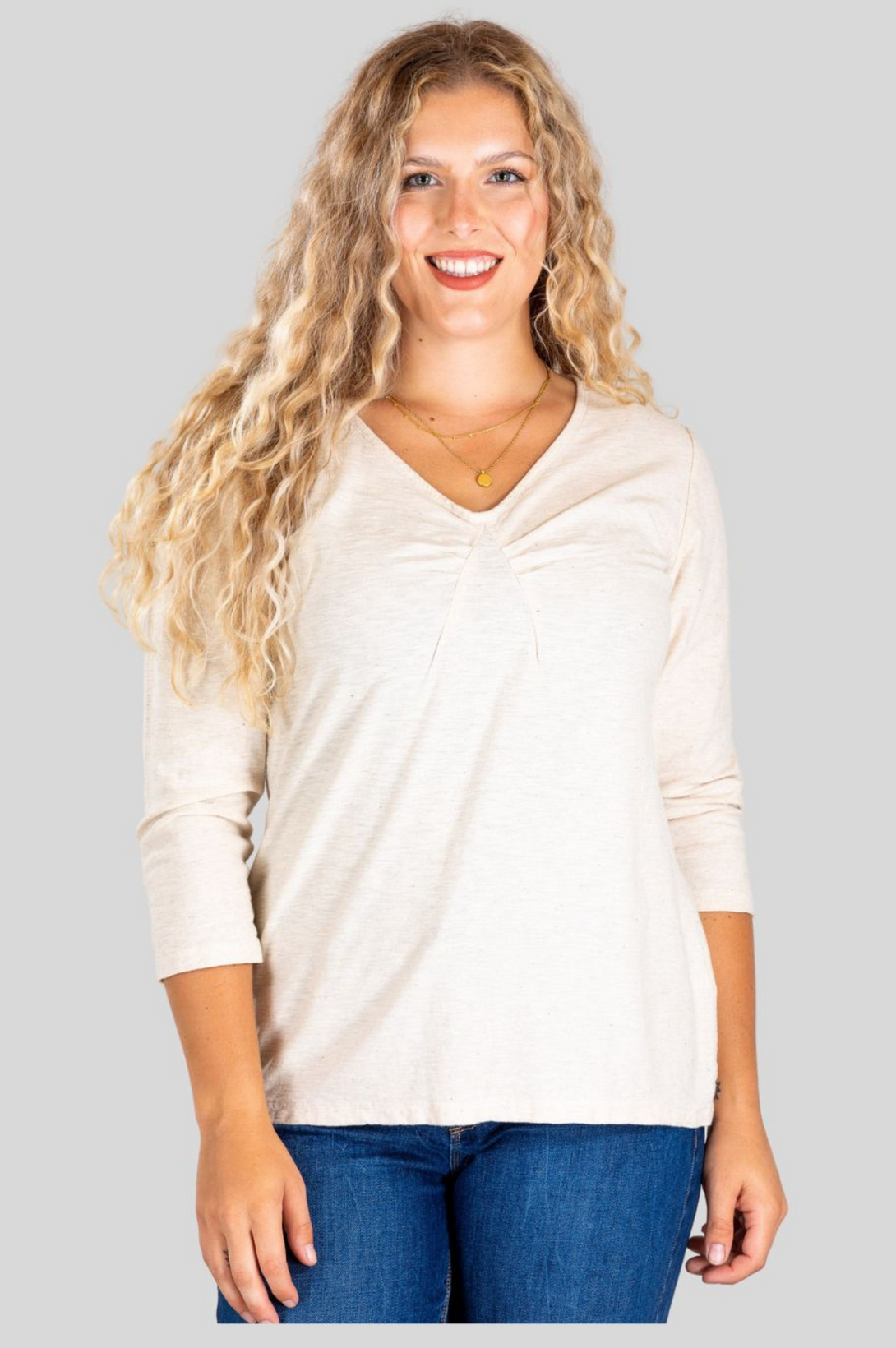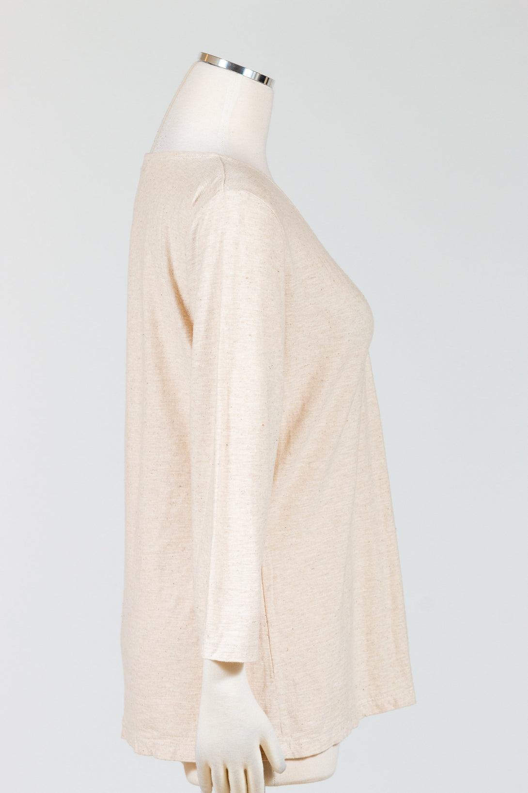 Cut Loose Tuck Front Tee has soft V-neck with a tucked bust detail and three-quarter length sleeves. This top has a trim fitting shape that gently falls at the hips. Made of cotton and linen knit fabric that is comfortable and breathable for all season dressing.